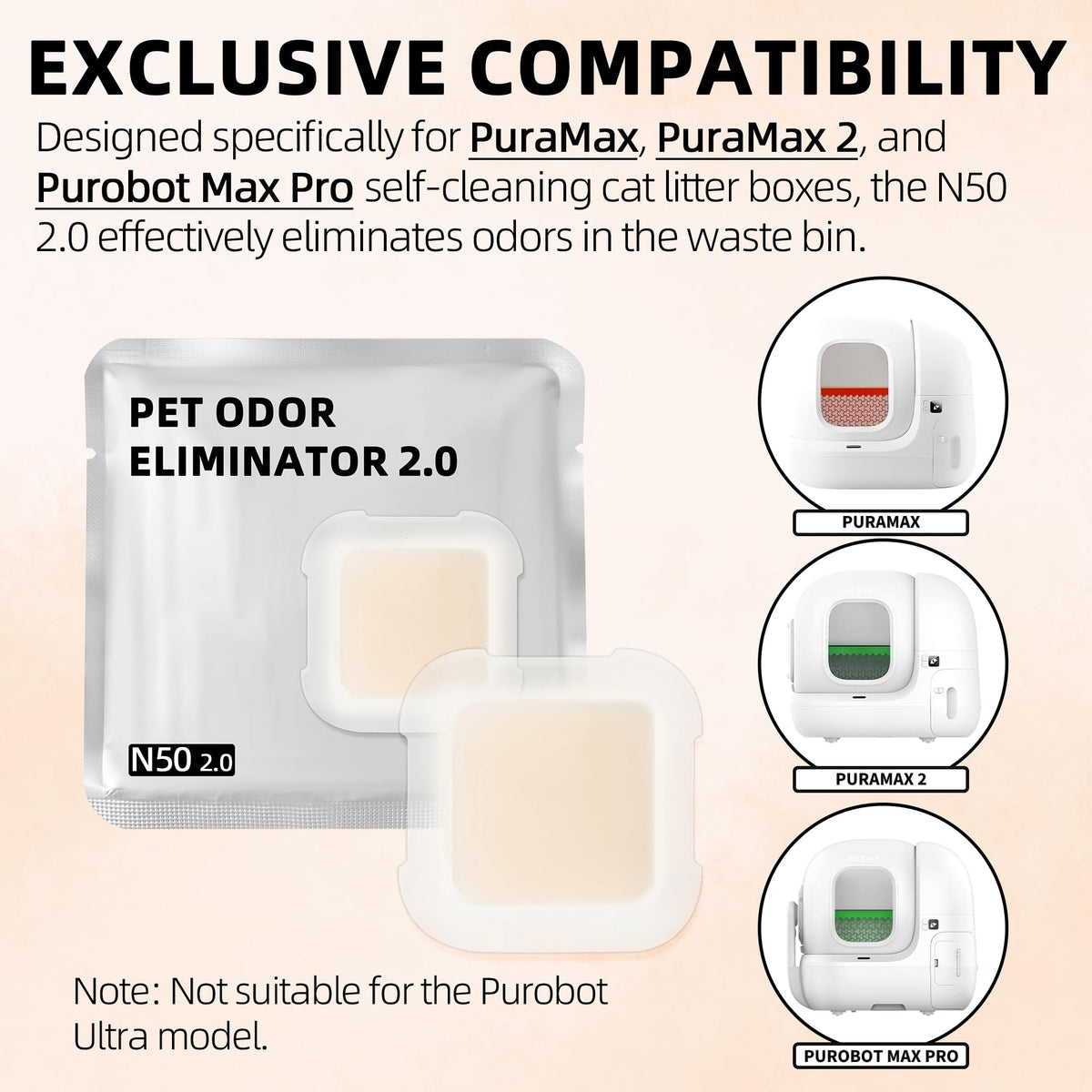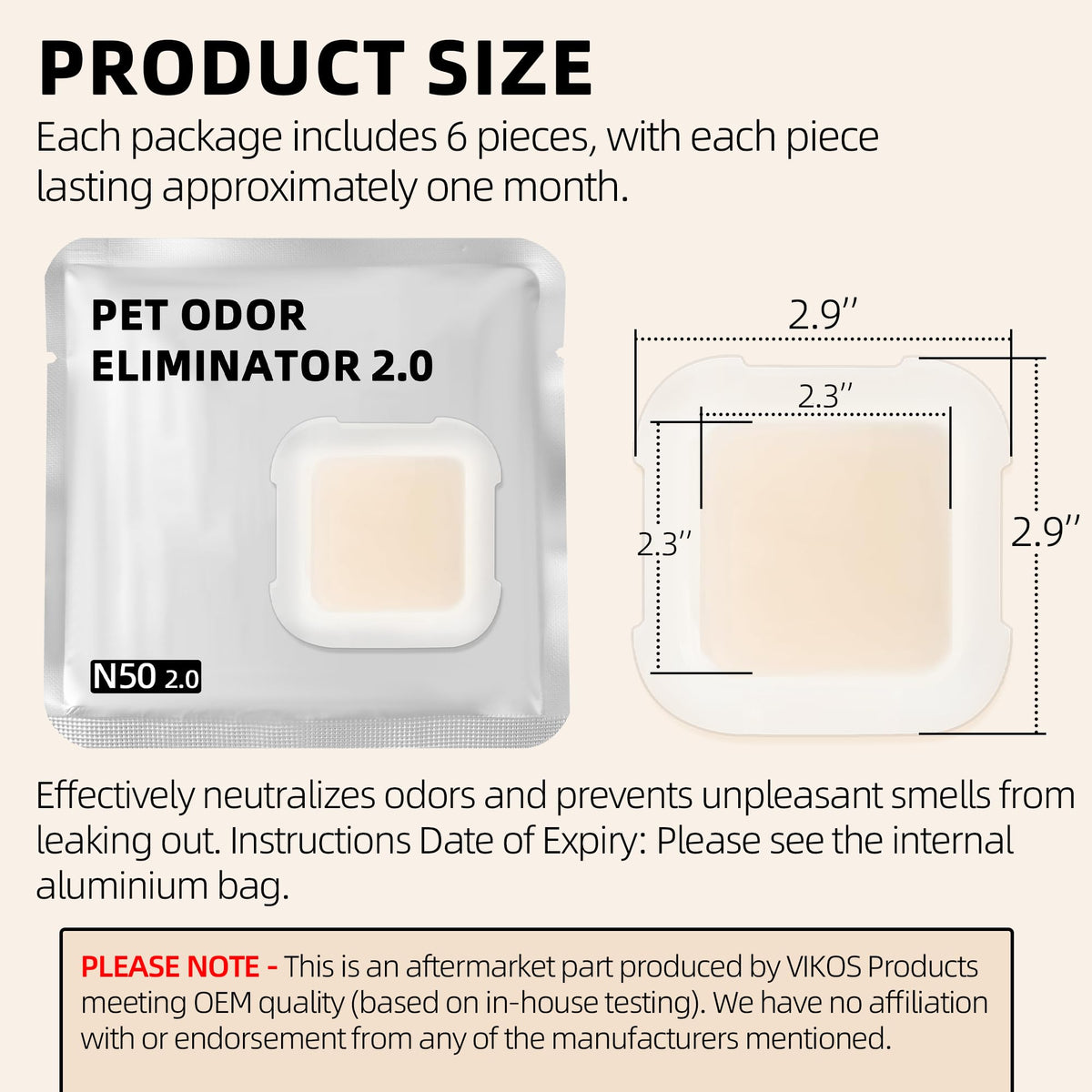Exclusive Compatibility - Designed Specifically For Puramax, Puramax 2, And Purobot Max Pro Self-Cleaning Cat Litter Boxes, The N50 2.0 Effectively Eliminates Odors In The Waste Bin. Note: Not Suitable For The Purobot Ultra Model. Easy Installation - For Puramax Users, Remove The Silicone Cover On The Waste Bin Lid Before Installation. The Straightforward Setup Ensures Seamless Integration With Your Litter Box. Long-Lasting Effectiveness - Each Package Includes 6 Pieces, With Each Piece Lasting Approximately One Month. Effectively Neutralizes Odors And Prevents Unpleasant Smells From Leaking Out. Instructions Date Of Expiry: Please See The Internal Aluminium Bag. Improved User-Friendly Design - Features A Plastic Casing To Keep Your Hands Clean During Replacements, Making The Process More Hygienic And Convenient. Important Usage Notes - 1. This Product Is Not Edible, Please Keep It Out Of The Reach Of Children And Pets; 2. Please Keep It In A Cool Place Away From Light And Sealed, And Keep It Away From Fire; 3. The Color Change And Small Amount Of Water Droplet Caused By Long-Term Storage Is A Normal Phenomenon, Not A Qualityproblem; 4. Do Not Expose To The Sun While Using. Please Note - This Is An Aftermarket Part Produced By Vikos Products Meeting Oem Quality (Based On In-House Testing). We Have No Affiliation With Or Endorsement From Any Of The Manufacturers Mentioned.