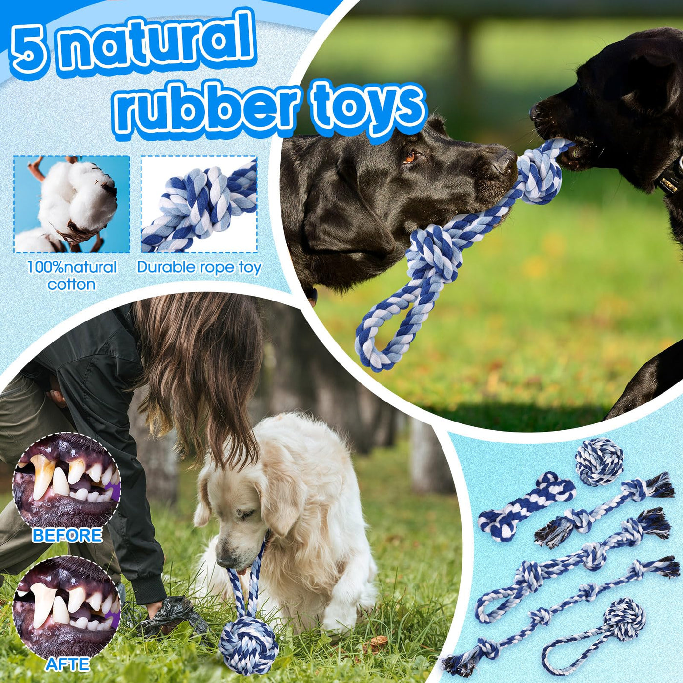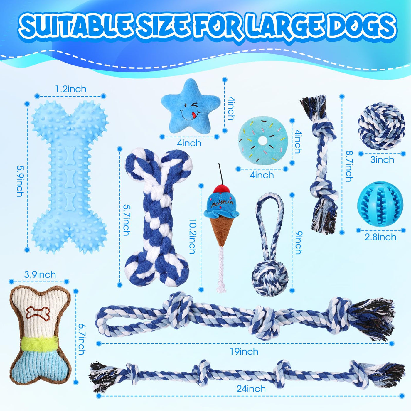Features: Large Dog Chew Toy Set: Pet Toys For Dogs Are Suitable As Dog Birthday Toys Or Holiday Surprise Sets For Dogs And Dog Owners. Dog Rope Toys Are Durable And Suitable For Aggressive Chewers Fun Interactive Large Dog Toys: Designed For Large Dogs, Suitable For Tug Of War, Throwing And Fetching In Interactive Games. Interacting With Your Dog Can Prevent Boredom, Reduce Stress, And Enhance Affection Specifications: Material: Cotton Rope, Plush, Rubber Color: Blue Size: Package Includes: 12 X Large Dog Chew Toy Set Notes: Manual Measurement, There May Be Slight Errors In Size. Due To Different Screen Displays, There May Be Slight Differences In Color. Small Items Are Included, Please Keep Them Away From Pets In Case Of Choking Risk. Before Purchase, Confirm Whether The Product Size Is Suitable For Your Pet, And Observe The Pet'S Reaction When Using. Please Remove The Product In Time If There Is Any Discomfort.