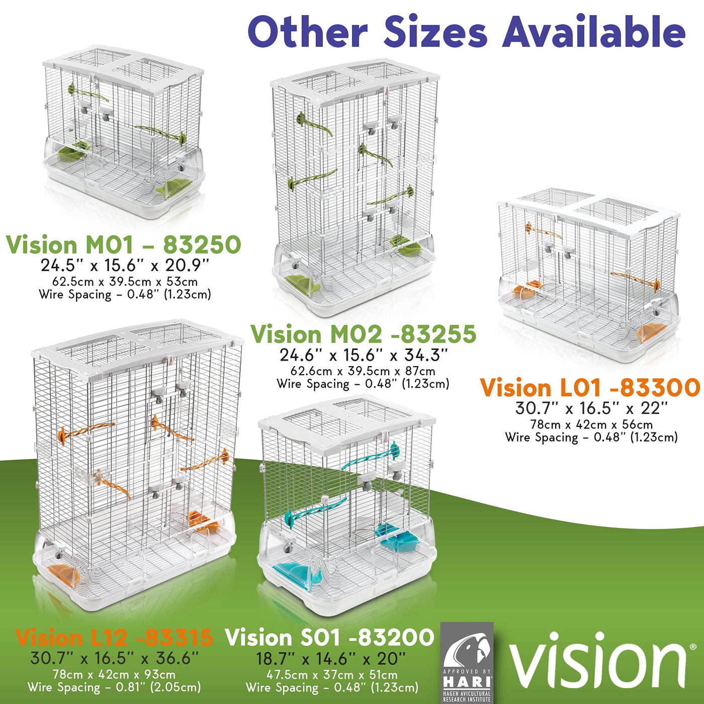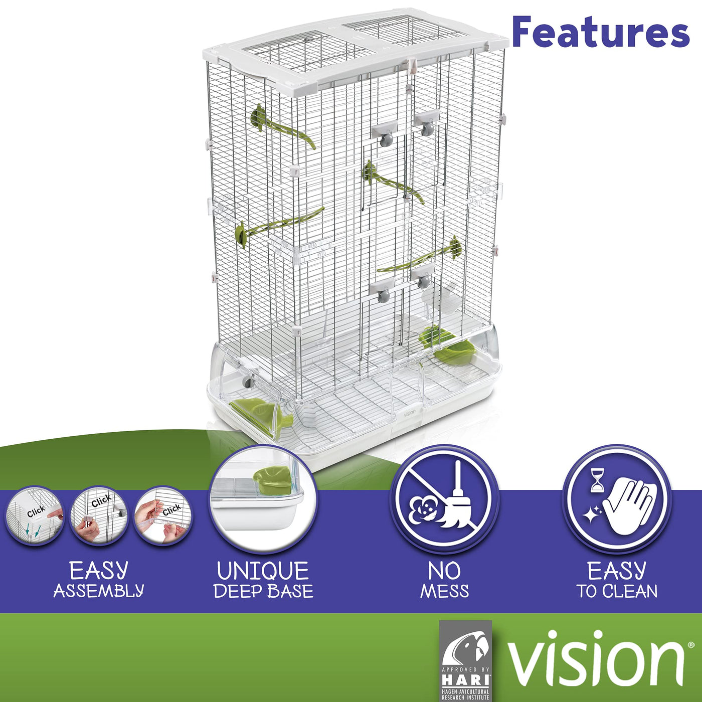 This Vision bird home has many revolutionary design features that set it apart from traditional bird cages. It provides your bird with lots of room to move around and bird movements cause air currents, which flow outwards, and in the case of most standard bird cages these air currents eject waste and seed debris outside of the cage and onto the floor. With Vision Cages, the combination of the debris guard, the deep base and the placement of the seed and water cups helps combat air currents to keep the majority of the waste and debris inside the cage. Most cages come with pull-out drawers that fail to do a good job of collecting bird waste and create maintenance headaches as a result. Vision's unique no-drawer design simplifies cage cleaning-simply detach the cage portion and empty the contents of the base into the waste bin. The result is less time-consuming, messy cleanups associated with bird keeping, leaving you more time to enjoy your pet. Vision's deep base can handle multiple types of litter, while raised ridges inside the base provide air circulation .The bird home also allows non-invasive, exterior access to seed/water cups, reducing stress to birds during maintenance. In addition, multi-grip perches promote circulation and help stop foot problems. The knock-down cages are easy to assemble with a five-minute quick, click-snap assembly. Vision bird homes are available in a variety of sizes, including small bird cages or large wire cages. They are recommended for bird species as listed due to their natural behaviors and not by size of bird. The medium cage is suitable for budgies, canaries, finches, parrotlets and lineolated parakeets. Vision also creates a variety of bird cage accessories including parakeet perches, parakeet toys, parakeet mirrors, bird baths, bird nest holders, bird cage stands and other parakeet supplies.
