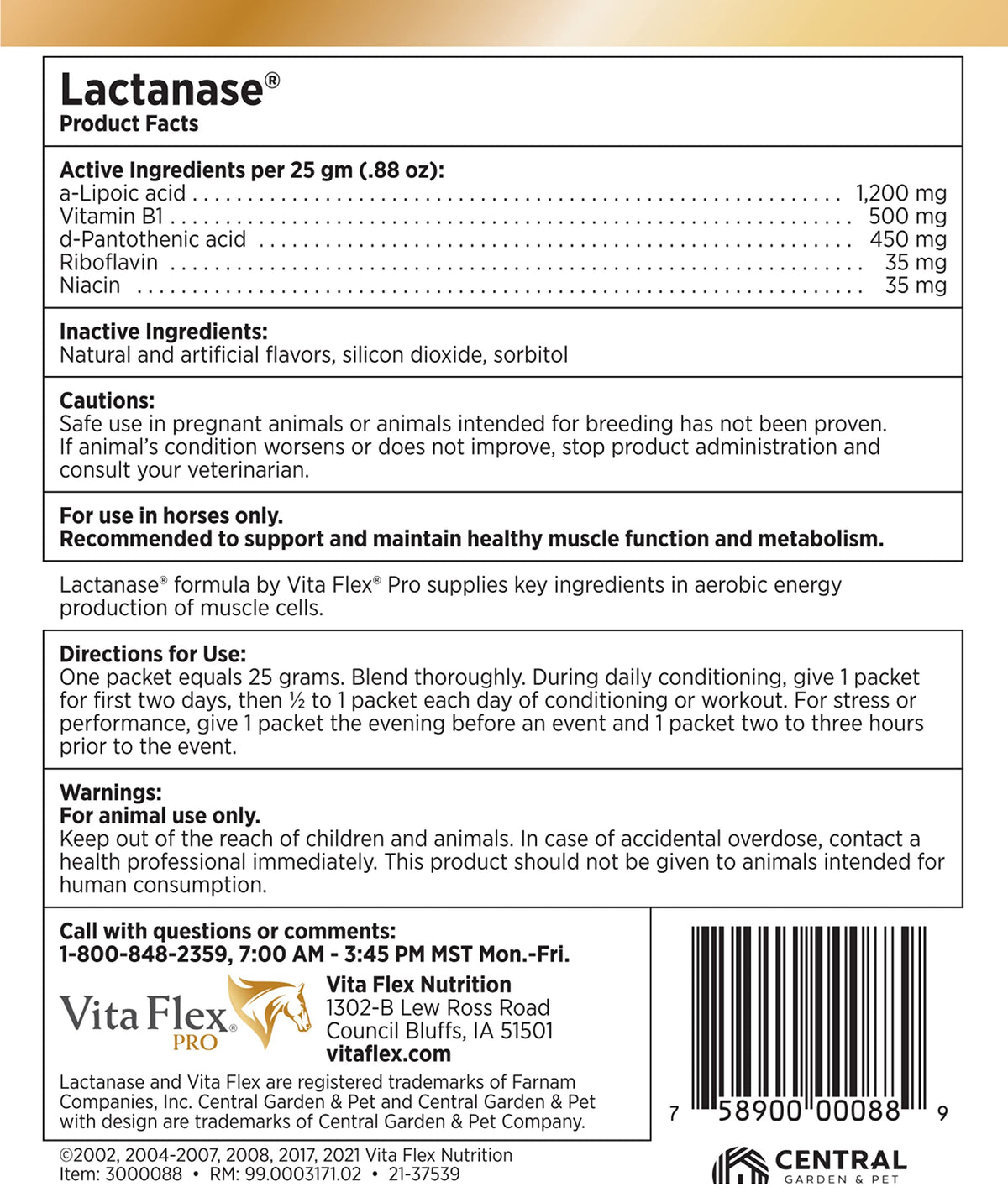 Vita Flex Pro Lactanase helps maintain energy for peak performance in horses in competition or workouts. This unique formula supports optimal muscle function and metabolism in horses. Lactanase is a unique supplement designed to supply key ingredients in the aerobic energy production of muscle cells. By increasing the capacity and efficiency of aerobic energy production it will help support stamina and endurance. Lactanase supplies antioxidants that help reduce oxidative stress associated with strenuous exercise. It supplies ingredients involved in the conversion of products of glycolysis (pyruvate) to acetyl coenzyme A, a key to efficient energy release. The formula contains no show prohibited substances. Please check with your association for testing rules and regulations.