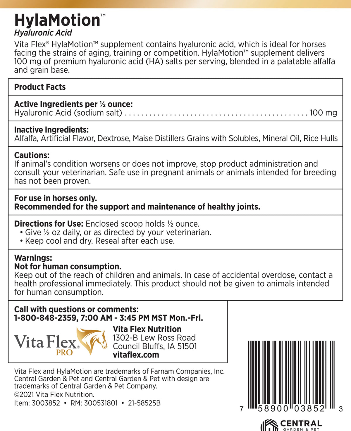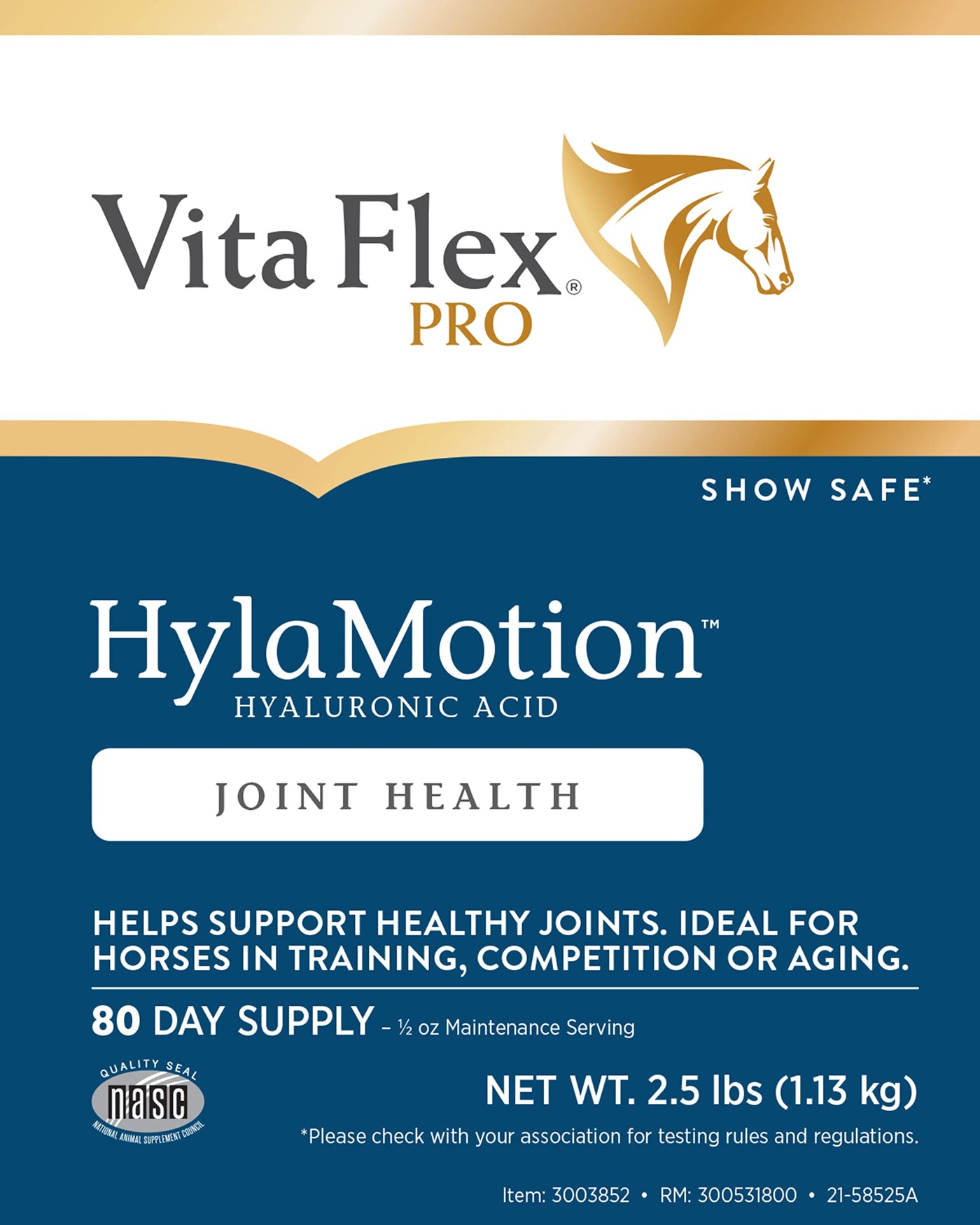 Vita Flex Pro Hylamotion Equine Joint Supplement delivers 100 mg of premium hyaluronic acid (HA) per serving, blended in a palatable alfalfa and grain base. Hylamotion HA is ideal for horses facing the strains of aging, training or competition, to keep joints lubricated. It is a major component of skin, cartilage and synovial fluid, the shock-absorbing fluid in the joints. Hyaluronic acid is found both in joint fluid and the cartilage itself. It is a major factor contributing to the slippery feel of joint fluid. HA helps trap fluid in the cartilage and keeps it flexible and resistant to being overly compressed.