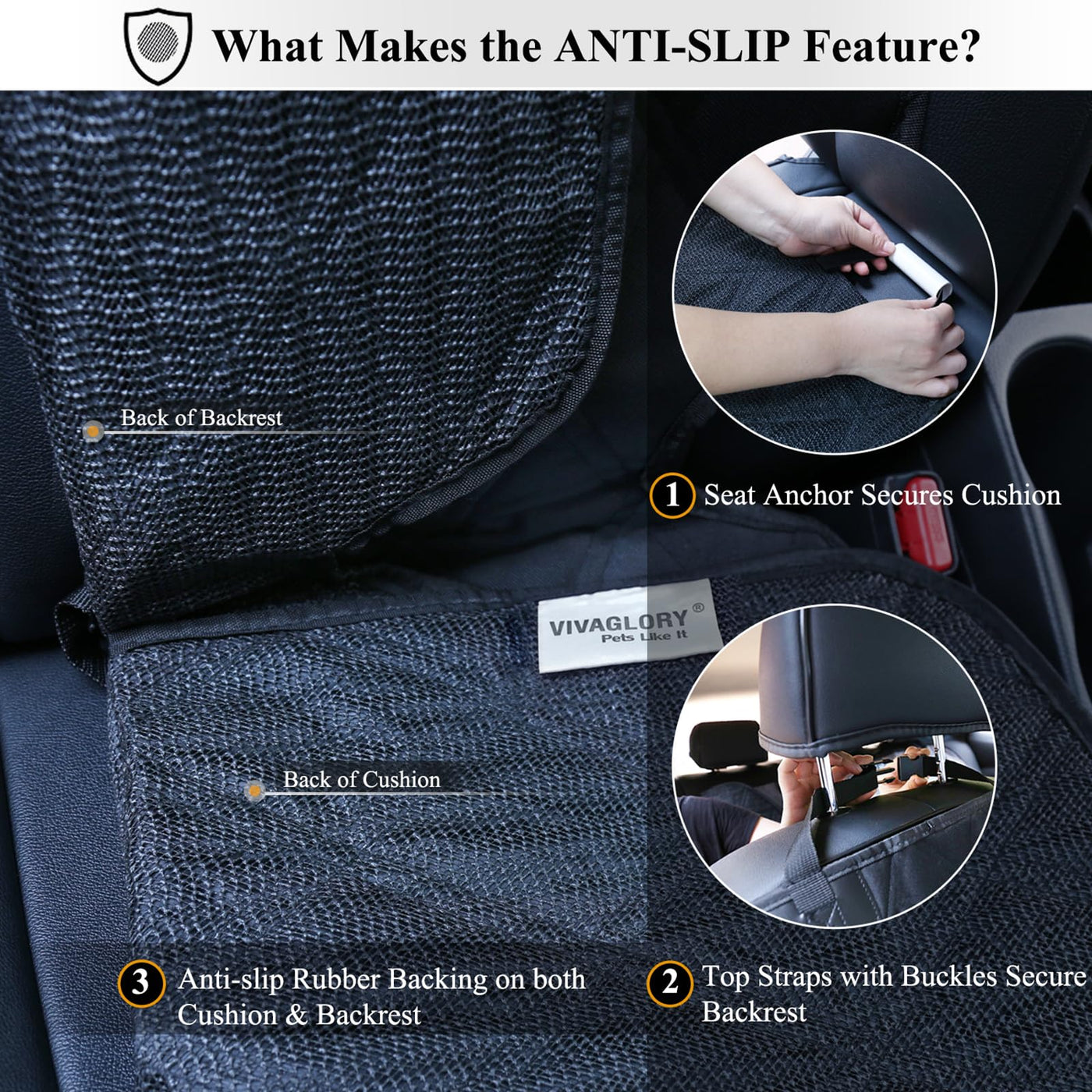 For most dogs, a car ride is one of lifes happy experiences, they love it. This is not the case for most dog owners though. The hairs, scratches & dirt that dogs create on car seats troubles you too much. No worries! VIVAGLORY dog seat covers come out to help. Heres what you would like to know: Features: Anti-slip: top straps with buckles, seat anchor keep the cover securely in place Waterproof: enhanced waterproof 4 layered fabric protects your car against liquid and spills Comfortable: quilted structure, thicker than average, makes the cover comfortable; happier than ever Safe: seat belt opening for you to harness dog and equip with seat belt; safer than ever Multiple Choices: Colors: black, grey, heather black and heather khaki Sizes: Backrest measures 23.2'' (L) x 20.1'' (W); seat measures 24.8'' (L) x 20.1'' (W) Universal Fit: fit front seat, bucket seat for all standard car, SUVs & MPVs Notes: length refers to TOP-TO-BOTTOM distance, and width means DOOR-TO-DOOR distance How to install: Step No.1: Tuck in seat anchor(s) overleaf Step No.2: Strap headrest and snap buckle(s) Step No.3: Adjust top straps & seat cover for best match How to clean: For small messes: simply wipe clean or vacuum For thorough cleaning: rinse off, hang to air dry Precaution: To protect your car seat better, please avoid liquid & spills around seat belt openings This dog seat cover is not a safety device, please harness your dog and use it with dog seat belt Includes: Dog Front Seat Cover 1