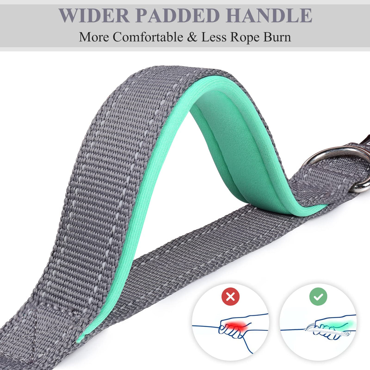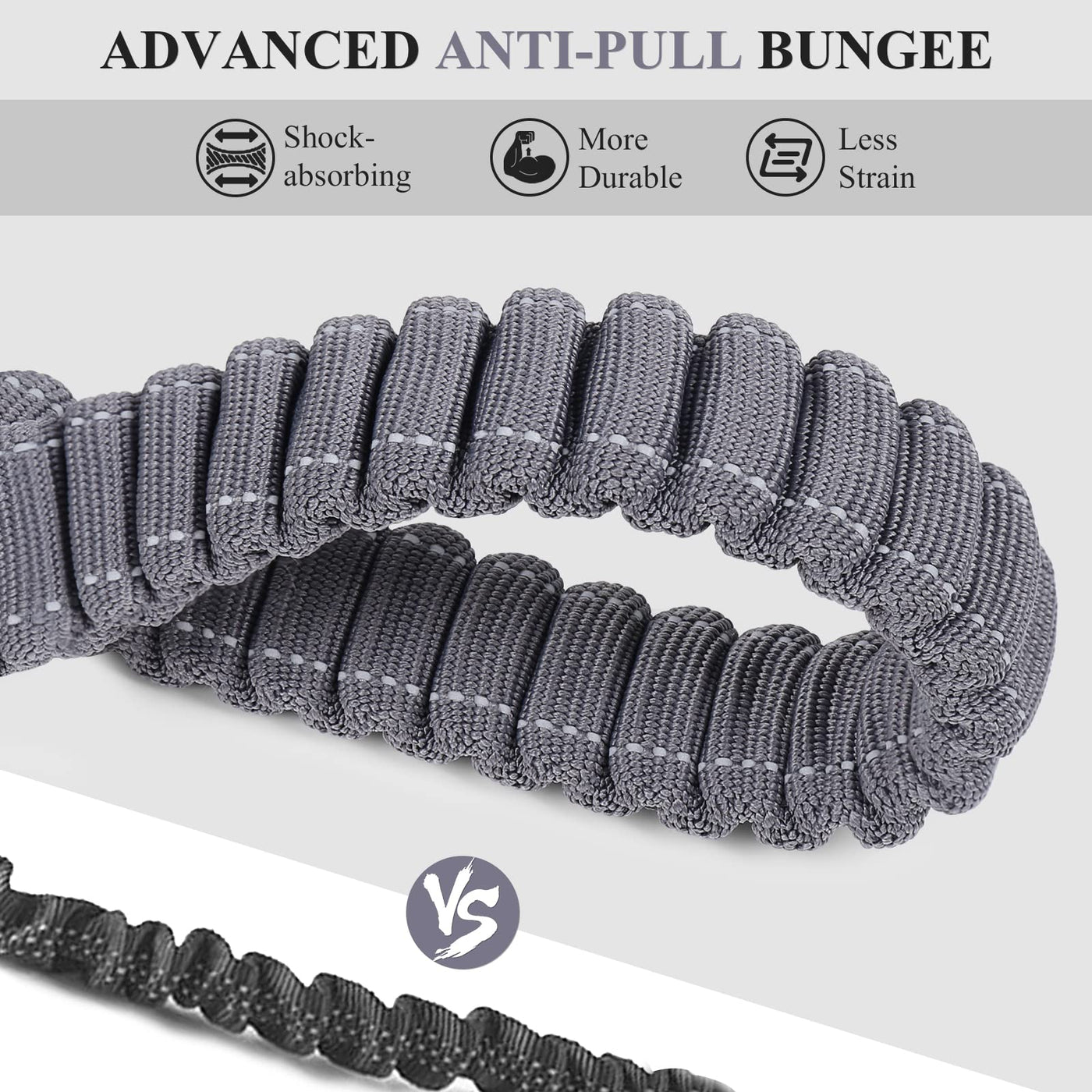 Q: How does the anti-shock feature work?A: The leash features an integrated internal bungee design that absorbs the pulling force of an excited dog, providing a comfortable experience for both you and your pet. This anti-shock mechanism helps reduce strain on your back and your dog's neck.