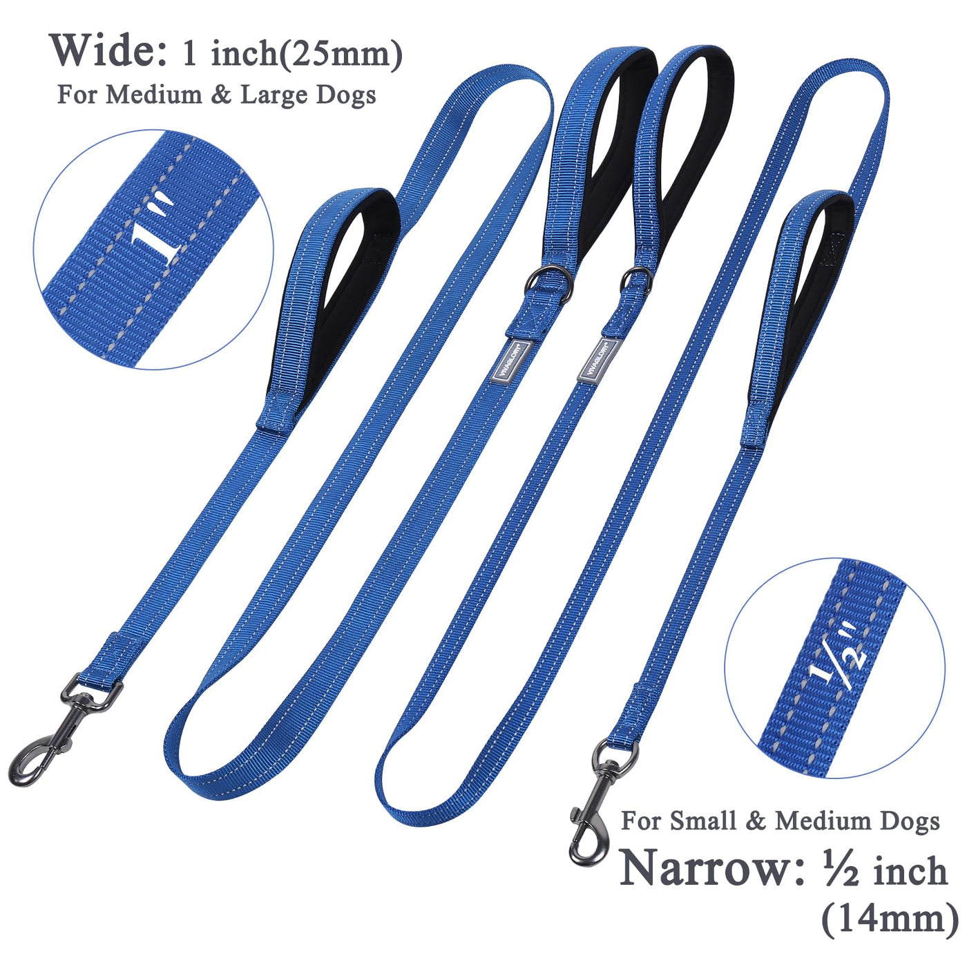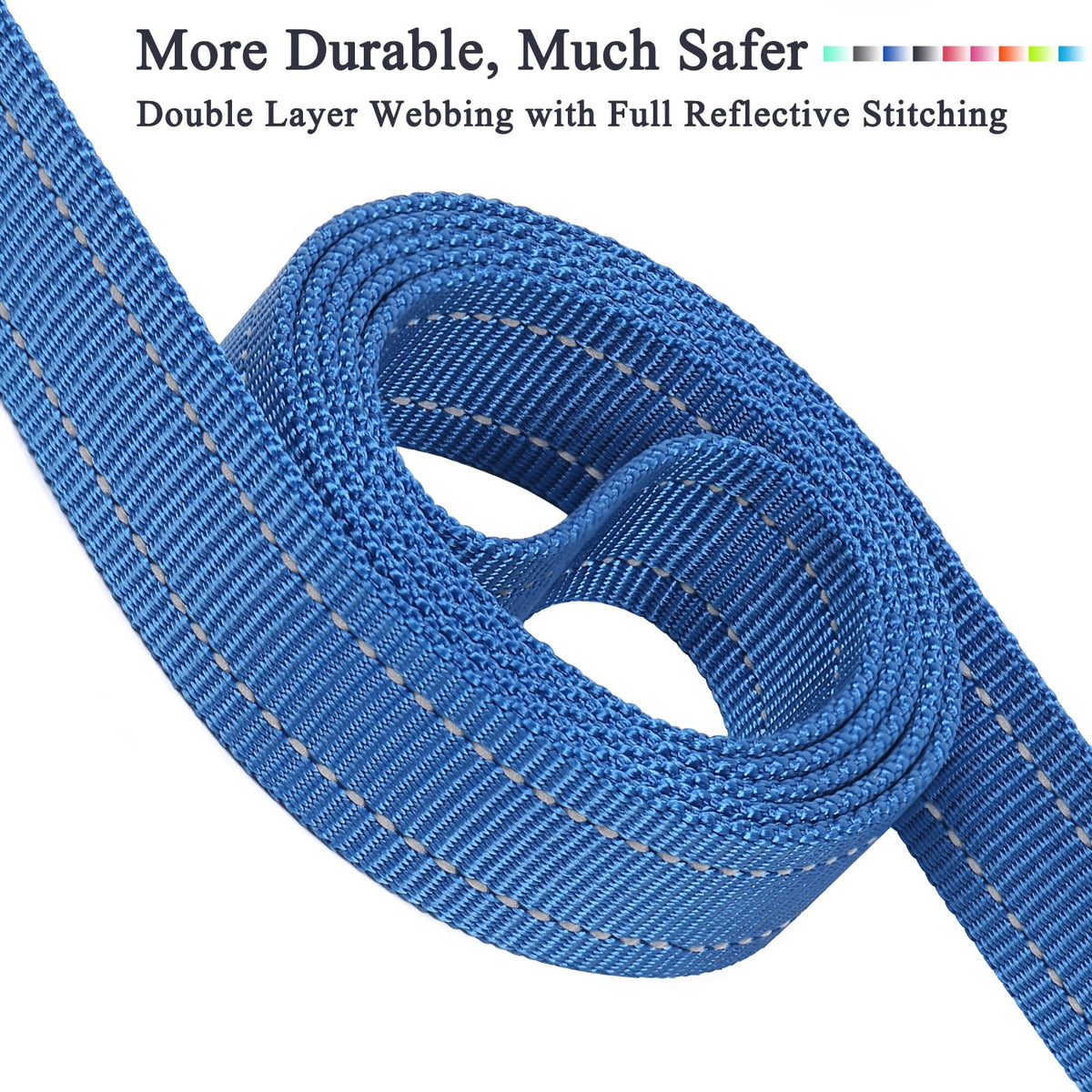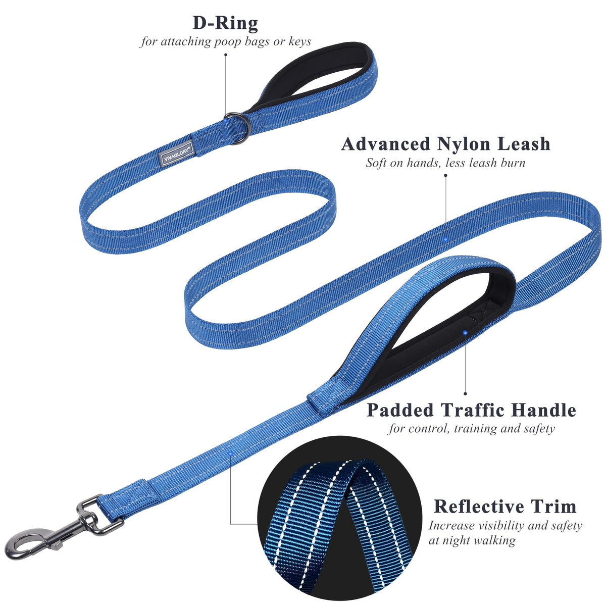 Vivaglory Traffic Handle Dog Leash, Two Padded Soft Handles Dog Leash, Strong Reflective & Metal Hook Training Pet Lead, Blue