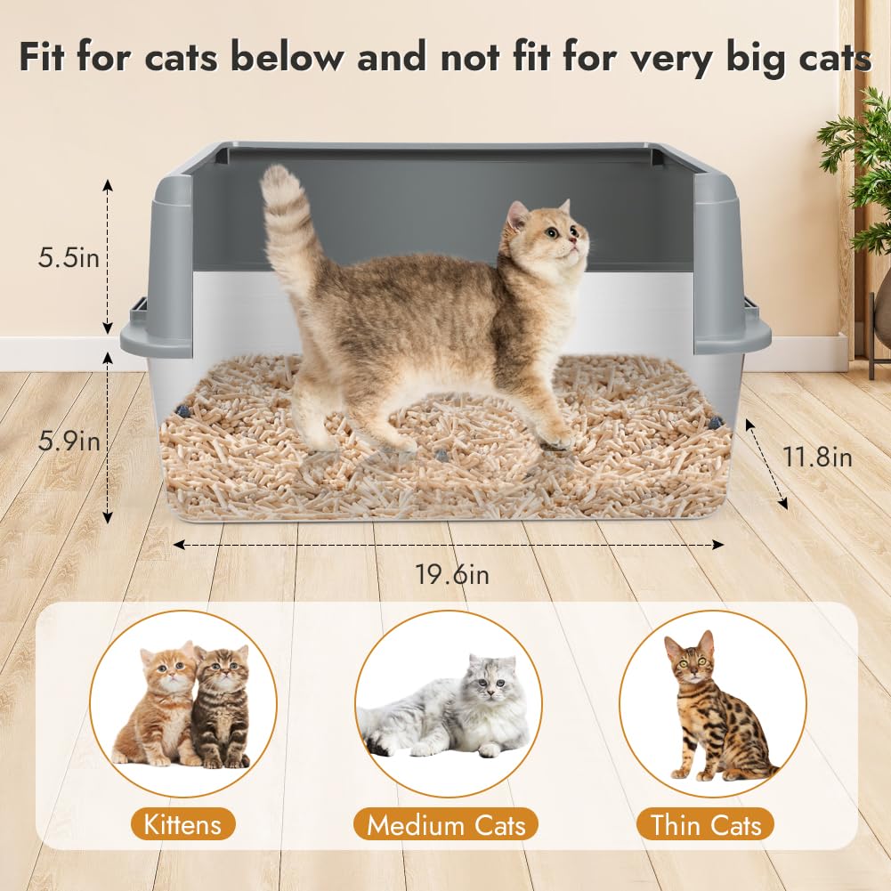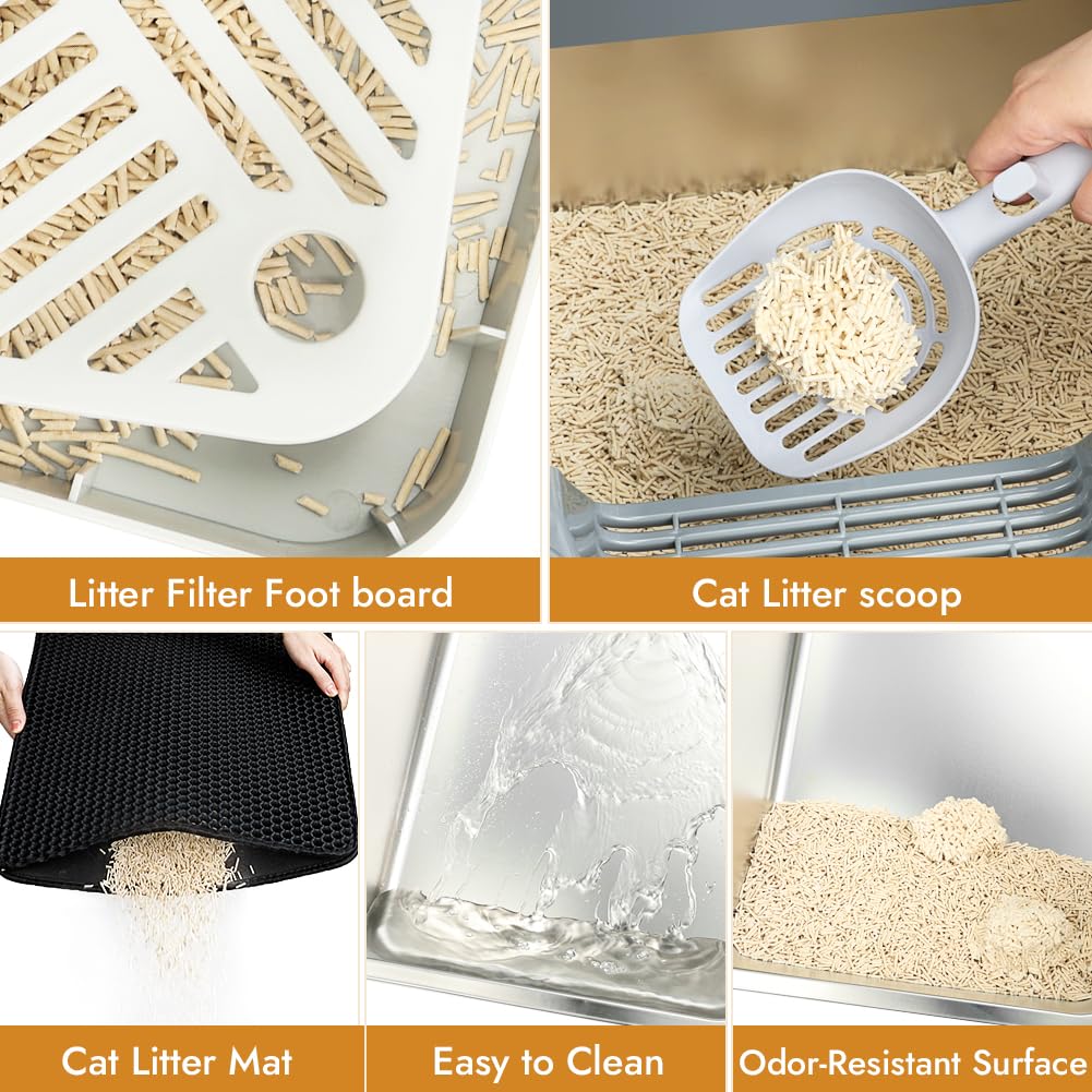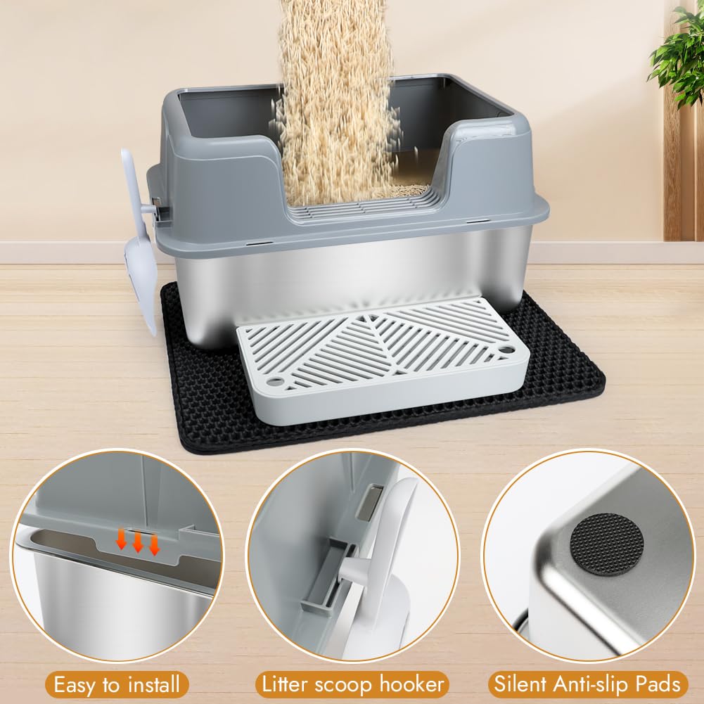 Specification:Material: Stainless Steel, Polypropylene Size: Large Dimensions: 19.6''L X 11.8''W X 11.4''H Color: Gray Package Includes: 1 Stainless Steel Litter Box, 1 Litter Mat, 1 Litter Scoop, 1 Foot Board Features:Robust And Durable Construction: Built With Thick Stainless Steel To Withstand Daily Use, Resisting Rust And Scratches For A Clean Environment. Streamlined Cleaning Process: The Non-Stick Surface Allows Waste To Slide Off Easily, Making Cleanup Effortless And Extending Product Lifespan. Thoughtful Features: The Large Litter Box Includes A Unique Filter Pedal To Contain Litter Scatter, And The Attached Scoop Allows For Quick Maintenance.
