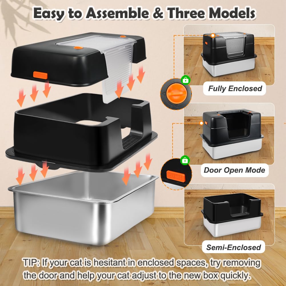Vivifying Xl Enclosed Stainless Steel Cat Litter Box With High-Sided Lid, Elevated Foot Board, Honeycomb Cat Litter Mat, And Sturdy Scoop- Anti-Leak, Easy Cleaning & Odor-Free (Black)Specification:Material: High-Quality Stainless Steel, Polypropylene Size: Extra Large Dimensions: 23.6''L X 15.7''W X 15.55''H Color: Black Package Includes: 1 Stainless Steel Enclosed Cat Litter Box, 1 Honeycomb Cat Litter Mat, 1 Cat Litter Scoop, 1 Cat Foot Board Features:1. Robust And Durable Construction: Made From Thick Stainless Steel, This Enclosed Litter Box Is Built To Withstand Daily Use, Resisting Rust And Scratches To Provide A Clean And Safe Environment For Your Cat. 2. Effortless Cleaning Process: The Smooth Surface Allows Waste To Slide Off With Ease, Simplifying Cleanup. Unlike Plastic Options, Stainless Steel Is Odor-Resistant, Extending The Product'S Lifespan And Reducing The Need For Frequent Replacements. 3. Thoughtful User-Centric Design: The High-Sided Enclosure Effectively Contains Litter Scatter, While The Included Litter Scoop Ensures Quick And Easy Maintenance, Making It A Practical Choice For Busy Pet Owners. 4. Easy Access For Senior Cats: The Spacious Foot Board Design Provides Easy Access For Older Or Short-Legged Cats, Ensuring They Can Use The Litter Box Comfortably Without Strain. 5. Perfect For Multi-Cat Households: The Extra-Large Size And Robust Design Make This Cat Litter Box Ideal For Multiple Cats, Providing Ample Room And Reducing The Need For Frequent Changes, Promoting A Clean And Harmonious Environment.