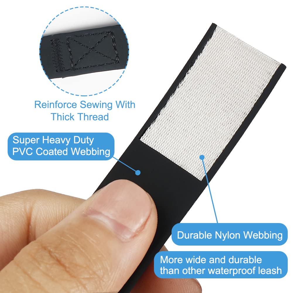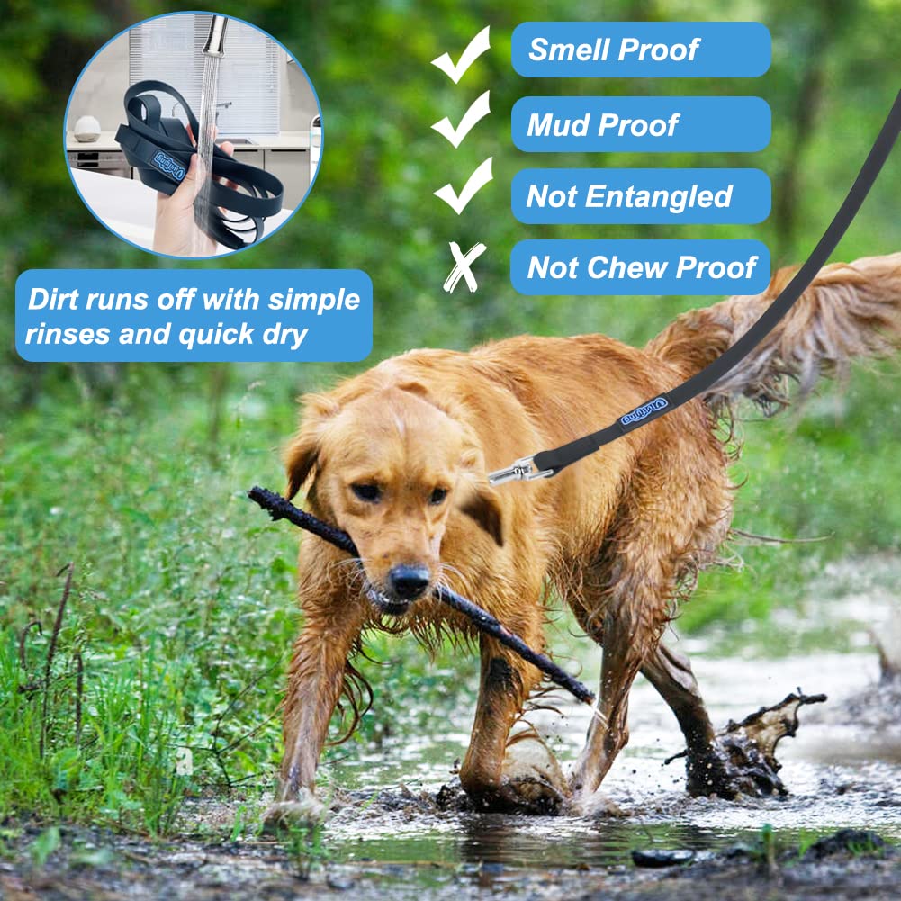 Q: What material is the leash made of and is it easy to clean?A: The leash is made from durable PVC coated webbing, which is 100% waterproof, quick-drying, and easy to clean. Simply rinse it off to remove dirt and debris.