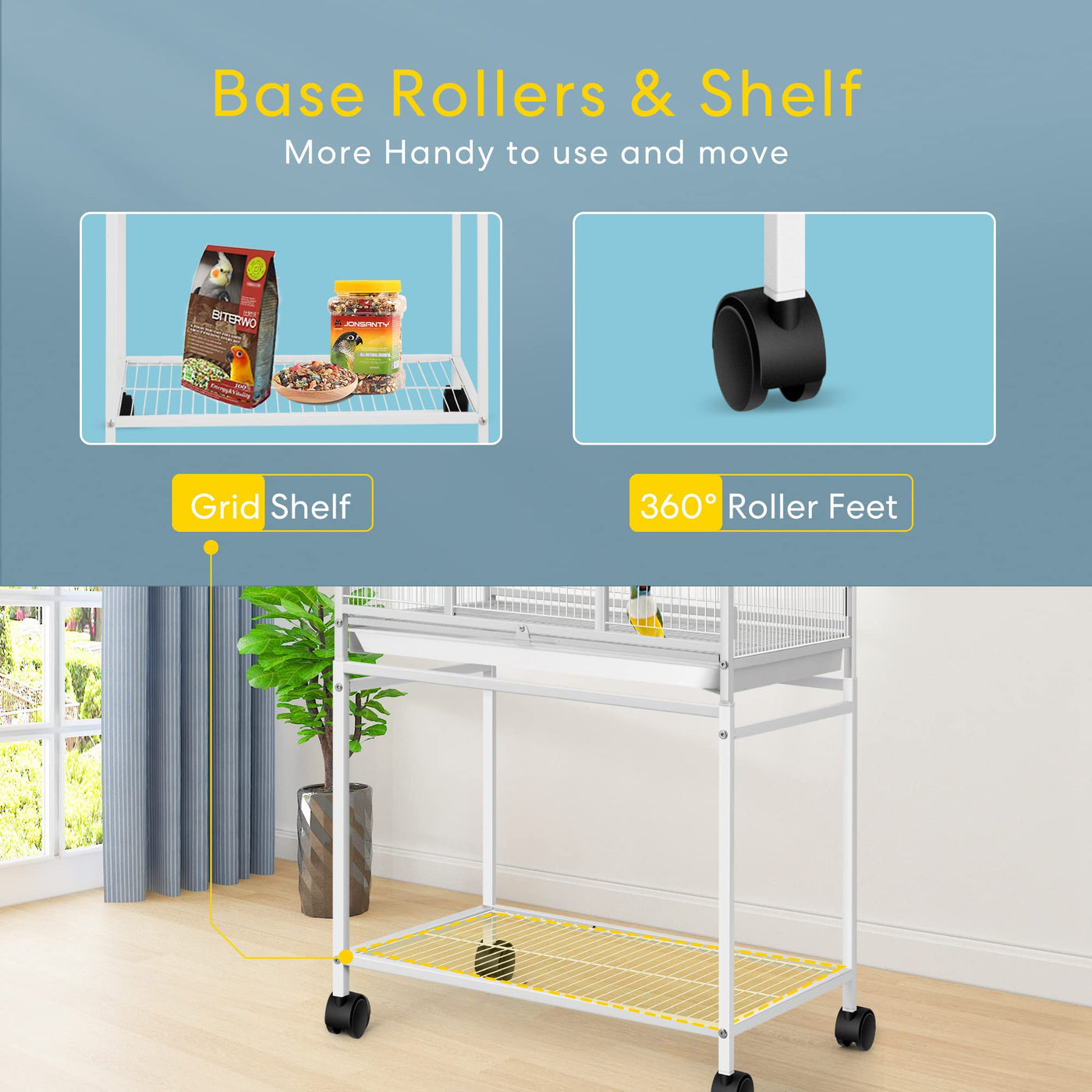 The VIVOHOME large birdcage creates an interesting living environment for birds, which is also a perfect home for your feathered friends. Unique safety lock design ensures birds will not run around, letting you do not have to worry about losing your birds. Say goodbye to the disassembly trouble, and you do not need to put your birds separately when you wash and clean the cage. Our birdcage takes the monotony out of your home and garden, keeping your bird friends company every day. Features: - Made of high-quality non-toxic steel frame which is corrosion-resistant and durable, with no chemical damage to birds. - This bird cage has the perfect anti-escape design, and can protect birds from opening the door and ensure the protection. - 4 universal wheels with the function of rotating and braking help you to move your birds wherever you want. - Abundant accessories include food boxes and perches, catering to different feeding and breeding demands. - The drawer-style tray is easy for you to observe and clean, maintaining a neat and tidy environment for your birds. - Note: This cage is a great home for Parakeets, Parrotlet, Green-Cheek Conures, little finches, and so on; Not suitable for Macaw, Cockatoo, and other big birds. Product Specification: - Materials: Steel + Plastic + Wood - Color: White - Bar Spacing: 0.4 Inch - Product Dimensions: 24.2 x 16.9 x 53.6 Inch - Product Weight: 23.1 lbs. - Package Include: 1 x Tray, 2 x Wooden Perches, 4 x Casters, 4 x Feeding Cups Product Warranty: -We assure that the item you received is 100% safe and sound. For any defective item, please contact our customer service for a satisfying solution.