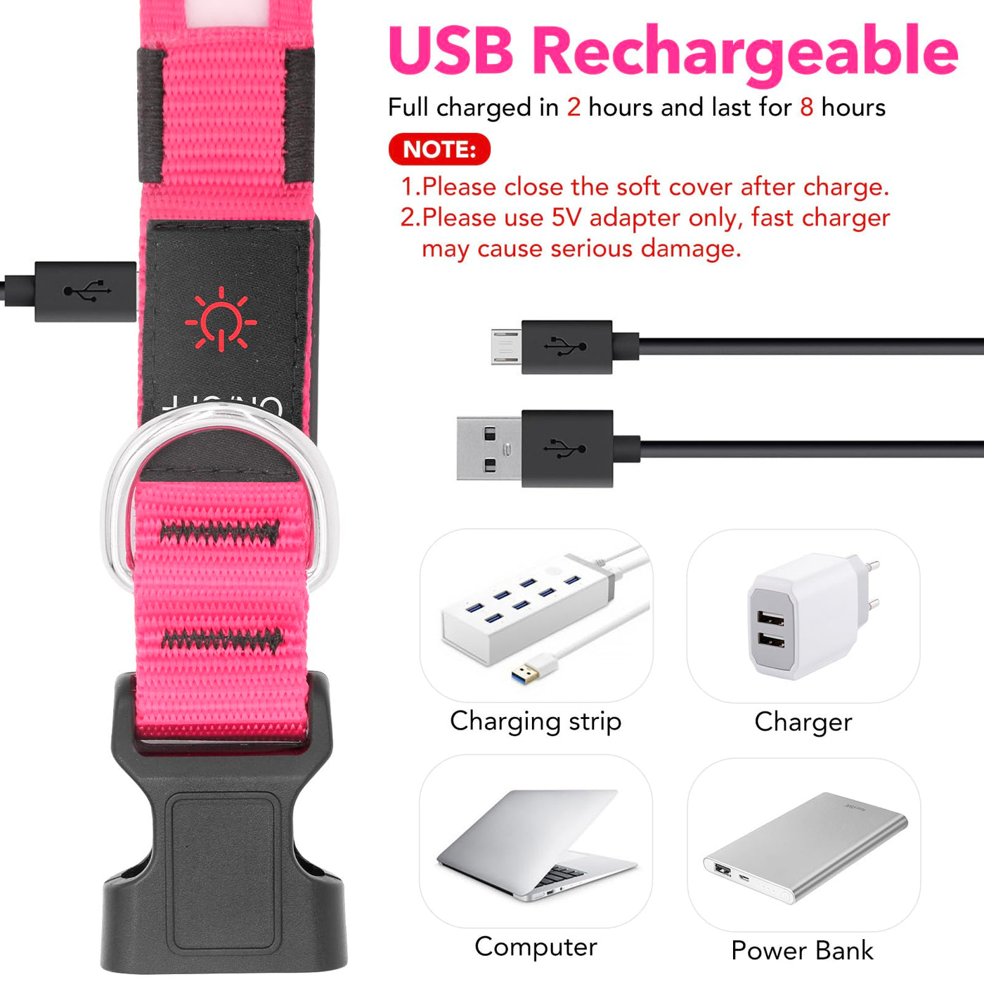 ?Lightweight &USB Rechargeable?-- Our dog collar light with a soft padded make your dog feel comfortable. Stop wasting time with frequent battery changes or charging. It can be charged from any device (except the fast charger) via any micro USB cable. It can be charged on computers car chargers power banks etc. NOTE:PLEASE USE 5V USB ADAPTOR ONLY.