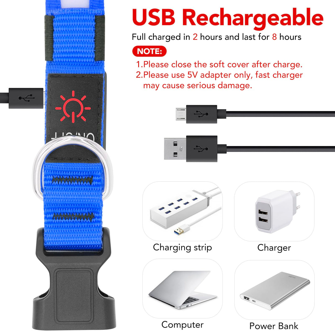TPU Material & Adjustable -- Made of durable TPU and Nylon material it can make your pet more comfortableEach LED dog collar can be adjusted by buckle It also has a heavy-duty D-ring that can be attached with any dog leash ightweight &USB Rechargeable-- Our dog collar light with a soft padded make your dog feel comfortable Stop wasting time with frequent battery changes or charging It can be charged from any device (except the fast charger) via any micro USB cable It can be charged on computers car chargers power banks etc NOTE:PLEASE USE 5V USB ADAPTOR ONLY High Visibility & Safety-- Vizpet light up Dog collar with high quality flat optical fibers makes your dog for great identification and safety around the 500 meters 3 Mode Flashing Light -- Our LED collar only has one key to control the light You can change the Quick Flash Slow Flash Steady glow you want It can be fully charged in just 2 hours 8 hours for quick flash 12hours for slow flash and 3 hours for steady glow UARANTEE-- We are committed to satisfactory service and 60 Days guarantee for our customersIf you have any problem when received the goods please feel free to contact us