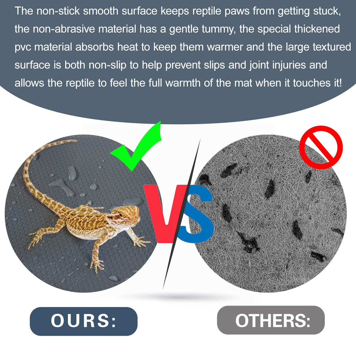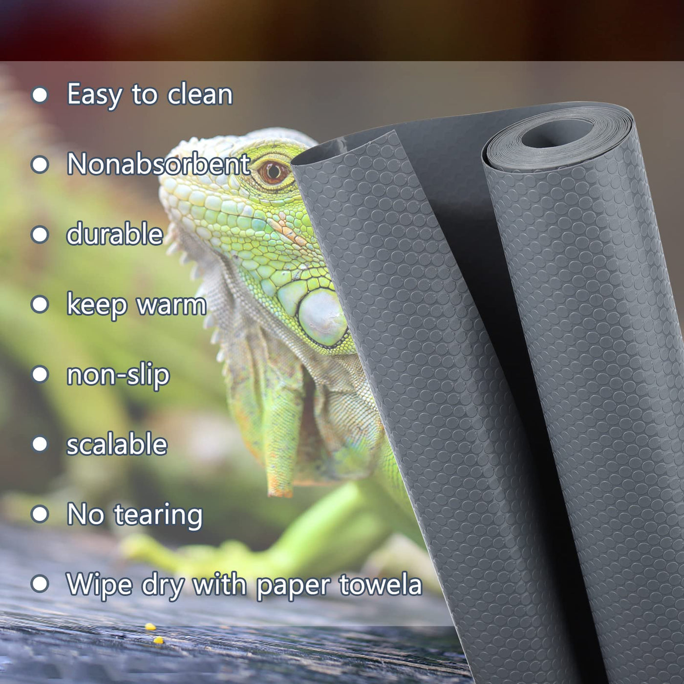 Bearded dragon bedding friendly mat - the non-stick smooth surface keeps reptile paws from getting stuck the non-abrasive material has a gentle tummy the special thickened pvc material absorbs heat to keep them warmer and the textured surface is both non-slip to help prevent slips and joint injuries!The color of grey can collect heat to keep warm and keep the whole tank bright giving them a clean environment