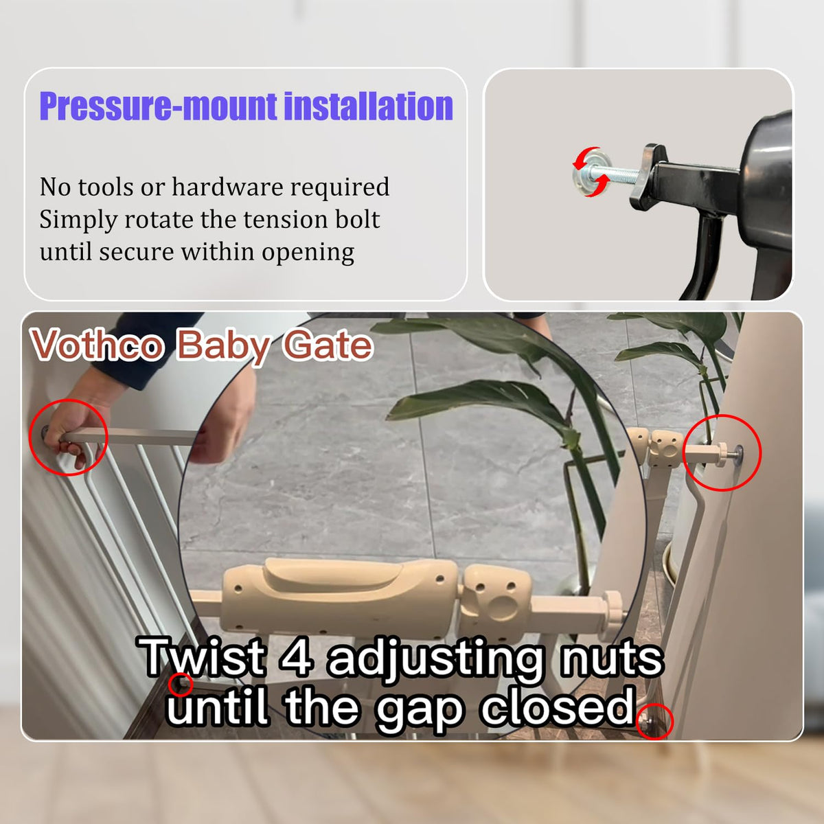 ?Customizable Width?Vothco baby gates extra wide fit 57.5 to 62.2 inches wide openings for doorways stairs. Also this large baby gate with 2.16 inches narrow spacing and 30 inches high for better child or pet safety | ?Durability and Multiple Uses?Vothco extra wide dog gate is made of thick metal for strength and durability to withstand 120 pounds.Designed to fit a variety of openings, this large dog gate can be pressure mounted in spaces that are extra wide, making this long baby gate perfect for use in large doorways, hallways, and at the top or bottom of staircases. | ?Double Lock System?A safety gate for kids or pets, with a double-lock system for better security, press the button at the top and pull it back with one hand to open this perfect baby gate easily for adults but difficult for children | ?Pressure-Mounted for Easy Installation?To get a perfect black or white metal tension baby gate, you only spend 15 minutes.Pressure mounted baby gate design requires no tools, no drilling,leaves a intact wall or stair for you while maintaining a modern appearance match with your decor | ?Double Sided and Auto Close ?Our extra wide baby pet gate has a 180