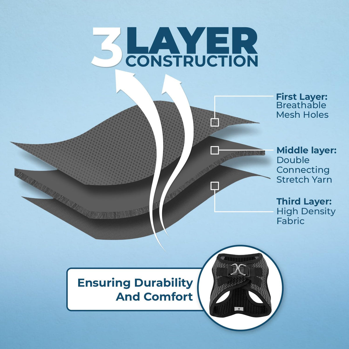 Q: Does this harness provide safety features for my pet during walks?A: Yes, the Voyager Step-in Air Dog Harness features triple security with a secure hook and loop fastener, a sturdy buckle, and double D-rings. These ensure your pet's safety while providing peace of mind during walks.