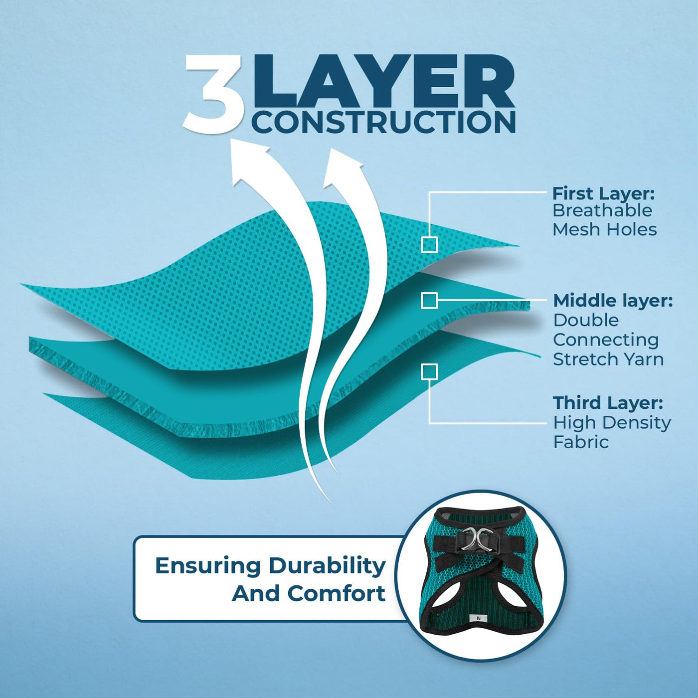 Q: What material is the harness made from and how does it contribute to comfort?A: The harness is made from a soft and breathable air mesh material, which is lightweight and fast drying, providing maximum comfort during walks in any weather.