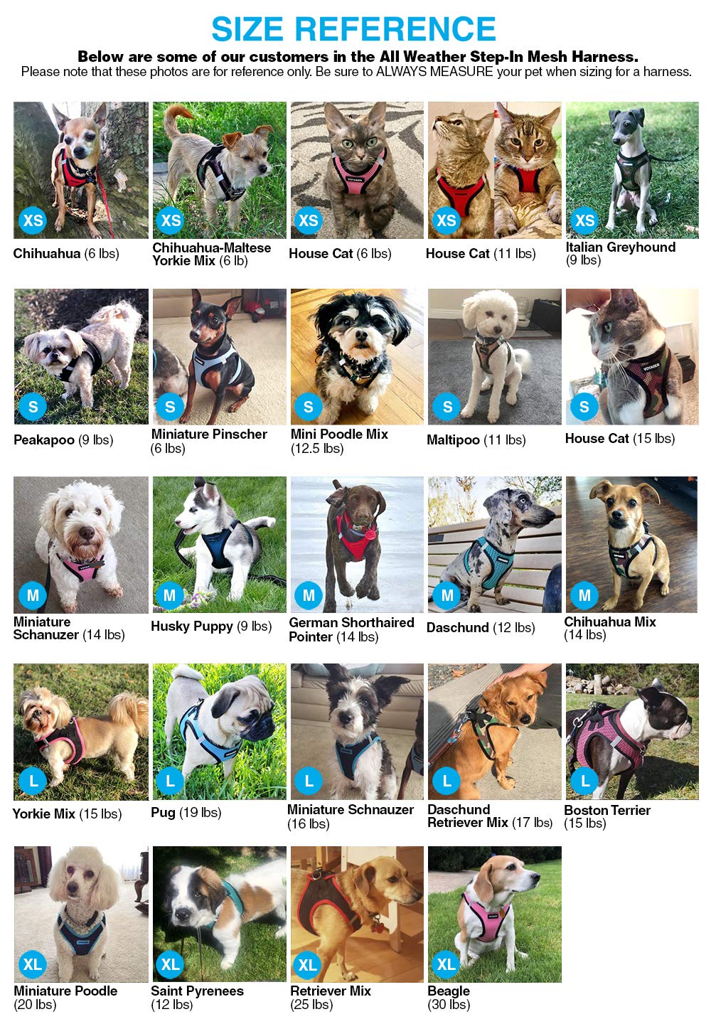 COMFORTABLY WALK YOUR PET NO MATTER THE WEATHER Our Step-In Air All-Weather harness is designed to ensure that regardless of the conditions outside, youll still manage to take your pet on those walks that get their tail wagging like crazy. Weve used mesh material that is breathable to keep your dog or pet cool on hot days, but also provides insulation for those chilly occasions And its going to be one comfy walk for your furball! Unlike leashes that have the tendency to strain your pets neck, this safety harness evenly distributes the pressure around the chest to prevent any kind of choking. Stress Free Walks Is it always a struggle trying to get your pet in most harnesses? Well, youll love just how easy this step in harness is to put on! Simply have your dog walk into it with their front legs, attach a leash, and youre good to go. But what really makes this support harness a must-have is how secure it is. Weve fitted it with a strong closure and heavy duty metal D-rings for double security. So youll never have to worry about your dog wiggling out of the harness while on your walks. Here are more reasons to love this great harness: • Non irritating material allows for all-day wear. • Available in a wide range of sizes (Please refer to the sizing chart). • Made with great attention to detail to ensure maximum durability. • Securely holds your pet while still being gentle. • Beautiful choice of colors to suit your pets personality.