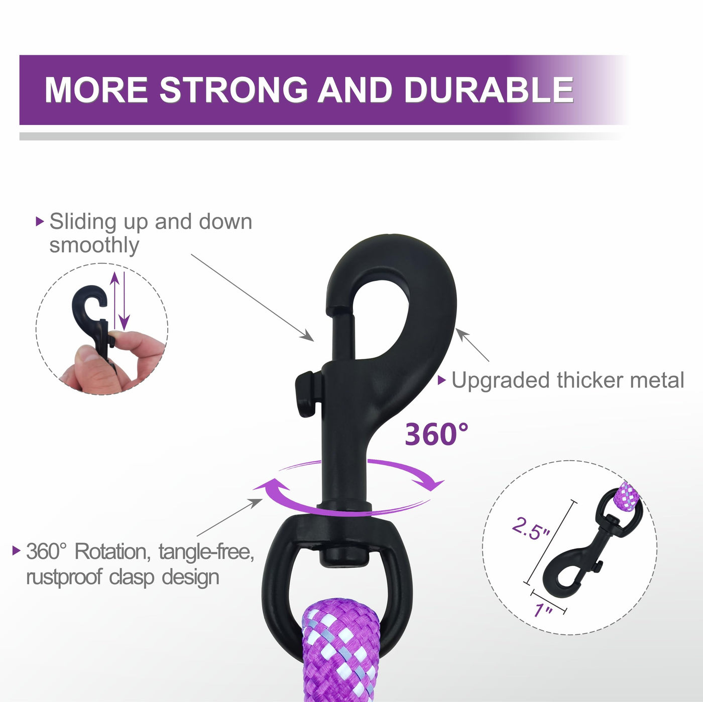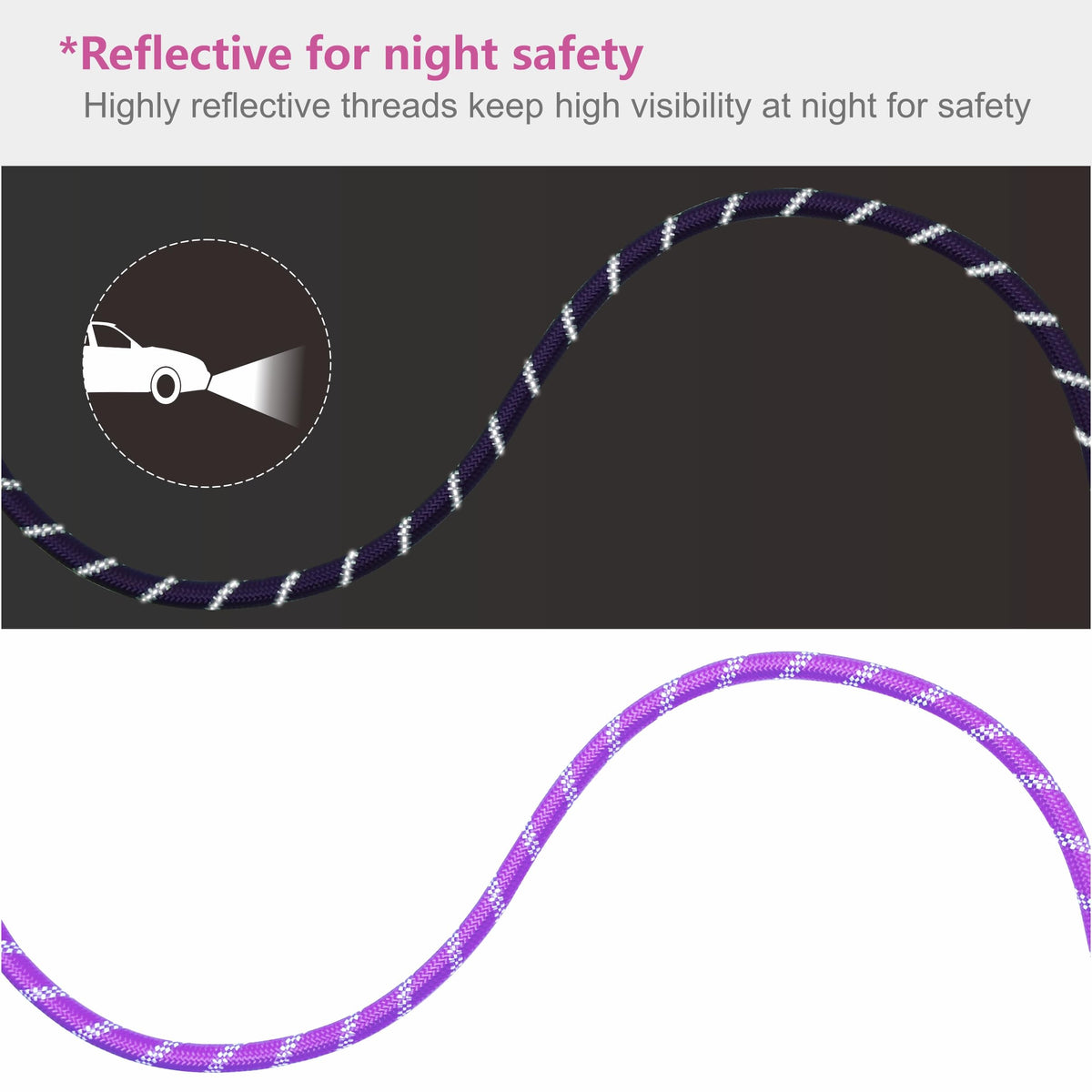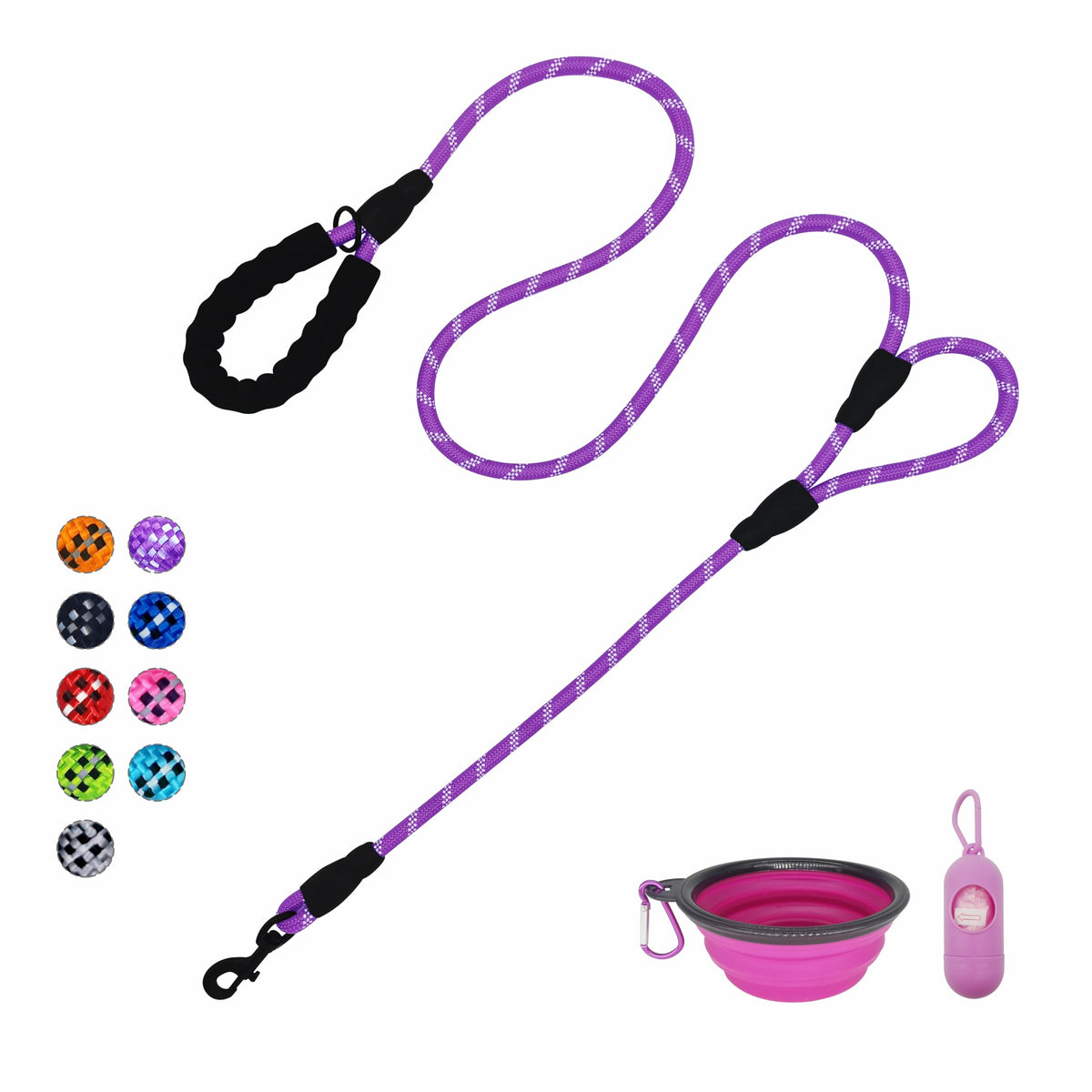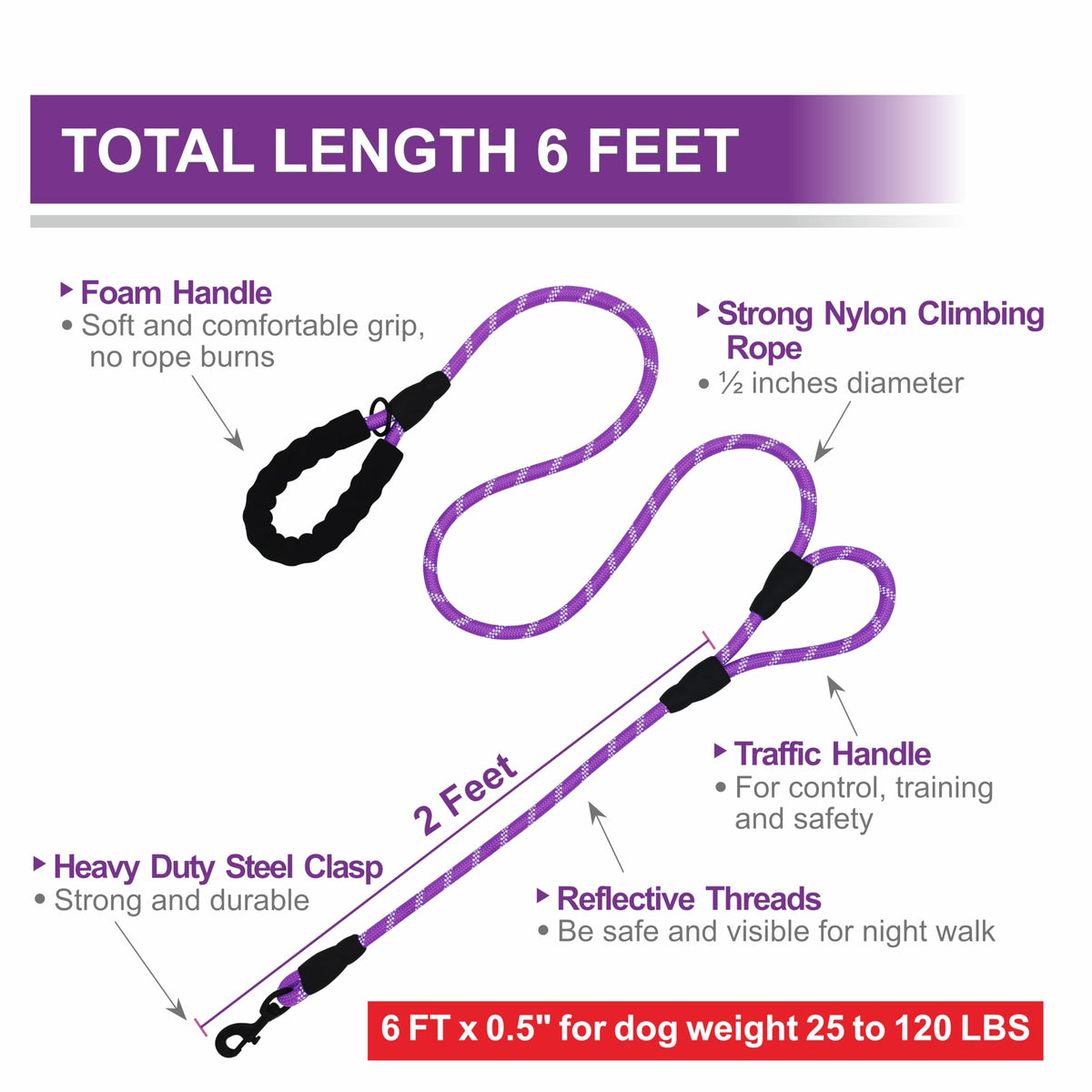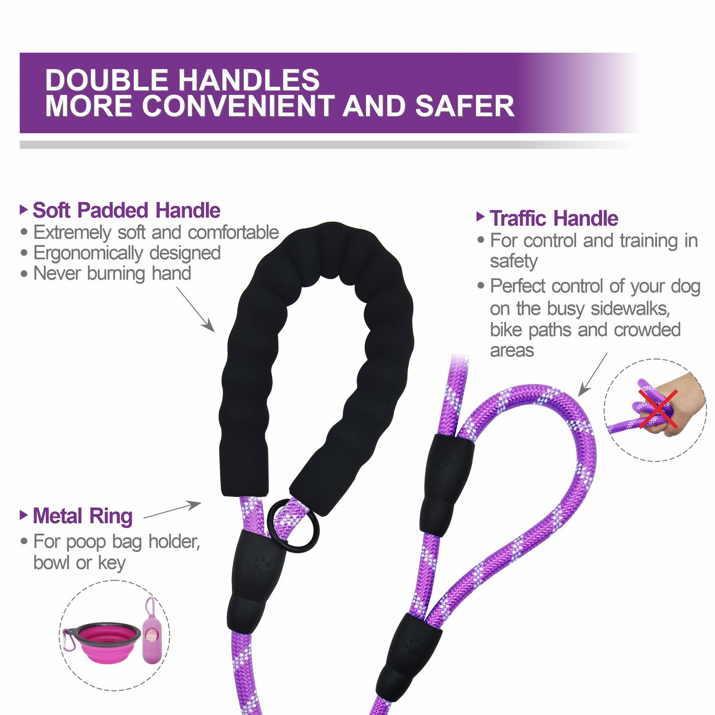 The Vozrels dog leash is made of strong 1/2 inches diameter nylon rock climbing rope with durable 360 rotating tangle-free and rustproof clip. Great suitable for medium and large dog. This rope leash is 6 feet long, feature dual handles included a soft foam handle design. Use the standard handle which is suitable for casual loose leash walking, allowing your dog to explore and take in the scents. Use the another traffic handle at 2 feet up from the metal clasp, it is perfect for heavy traffic areas, busy sidewalks, bike paths, street corners and crowded areas that need close-up control of your dog immediately. This dog leash is perfect balance between freedom and safety control, giving enough comfort and freedom to your dog, but everything is under your control well. Great for walking, running and training. For the foam handle with ergonomically designed for grip extra comfort. The padded handle is extremely comfortable grip while dog pulling, and it will protects your hand from rope burn. The round rope is specially designed with reflective stripe on the whole dog leash. The bright reflective stripe keeps high visibility at night and let your dog walk freely without leave your sight. Package Content: 1 x Double handle dog leash 1 x Silicone collapsible bowl 1 x Poop bag dispenser included 1 roll (15 Dog poop bags) Kindly notice: Please feel free to contact us if you have any problem about our product or service, we will solve it for you accordingly, much thanks for your great support !