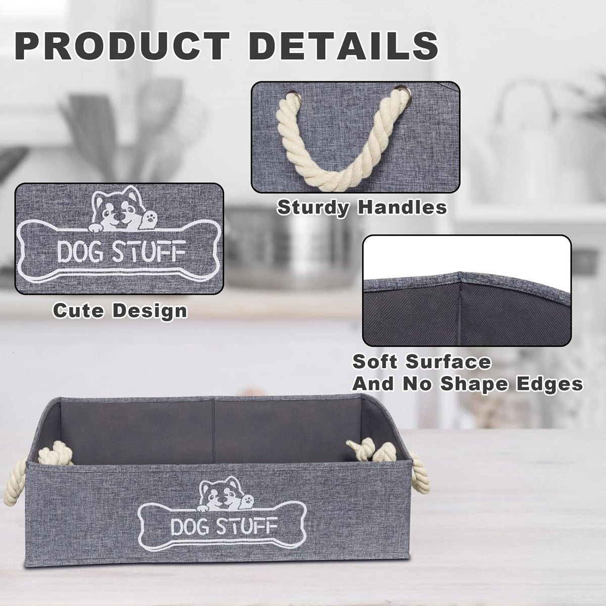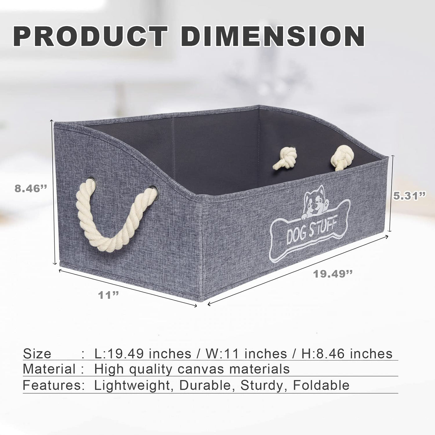 Product detail color: grey Measures: 1949L x 11W x 846H Package Includes: 1x Dog Toy Box Storage Premium Material And convenient Made of made of high quality canvas, sturdy and durable The heavy duty cardboard at the bottom keep the pet toy boxes shape And When your dog is geting the toy without knocking the whole toy bin over The low front design allows smaller dogs to get in more easily to grab toys they want Versatile Storage Basket The versatile toy bin can be used to pet bed if your dog love laying on their toys It folds flat for easy storage when not in use These cute dog toy box storage can easily be cleaned with a wet cloth when in dirty and keep your family room free of clutter Durable & Easy To Move The dog basket for toys stands upright and the convenient handles support weight of up to 25 pounds, sturdy and easy to carry Superior stitching ensures the dog toy storage basket will never fall or break apart Versatile Pet Toy Storage Perfect for all types of dog and pet toys, keep your family room organized You can also use the cute dog toy baskets for dry dog treats, leashes, collars, blankets and more So cute and a great way to organize the pet supplies