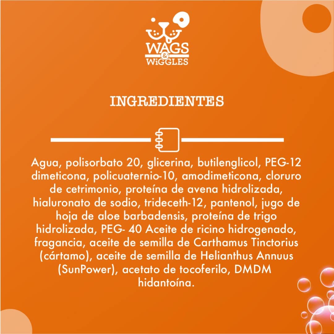 Wags & Wiggles offers a range of everyday lifestyle products including shampoos, conditioners, sprays, wipes, grooming tools, puppy pads, and more! Wags & Wiggles' fun and functional pet supplies make caring for your precious pup effortless and enjoyable! Wags & Wiggles dog grooming pet supplies are wacky, colorful, and fun. Wags & Wiggles Smooth Detangling Spray in Juicy Apricot Scent is the perfect pick me up when your pooch's coat needs brushing and refreshing! This detangling spray for dogs is the solution for a clean-smelling, brushed coat in seconds. This dog detangling spray leaves an apricot scent. Detangling Spray for dogs is formulated to soften the coat at the site of a mat. This can be used all over your pup's coat to deter future tangles. The Wags & Wiggles Smooth Detangling Spray in Juicy Apricot formula is especially formulated and pH balanced for your furry friend. Dog detangler spray is a speedy remedy to keep you and your pet at ease and without mats in between baths. You and your dog or puppy can have a blast, knowing that Wags & Wiggles dog detangling spray will do the job. Wags & Wiggles pet grooming supplies are paraben-free, DEA free, and SLS free. Dog grooming supplies are safe to use with topical flea and tick treatments. Directions: 1. Spray directly on knot & allow to soften. 2. Carefully brush out. Ingredients: Water, Polysorbate 20, Glycerin, Butylene Glycol, PEG-12 Dimethicone, Polyquaternium-10, Amodimethicone, Cetrimonium Chloride, Hydrolyzed Oat Protein, Sodium Hyaluronate, Trideceth-12, Panthenol, Aloe Barbadensis Leaf Juice, Hydrolyzed Wheat Protein, PEG-40 Hydrogenated Castor Oil, Fragrance, Carthamus Tinctorius (Safflower) Seed Oil, Helianthus Annuus (Sunflower) Seed Oil, Tocopheryl Acetate, DMDM Hydantoin. Safety Warning: Avoid spraying in eyes. Stop use if irritation occurs. Keep out of reach of children.