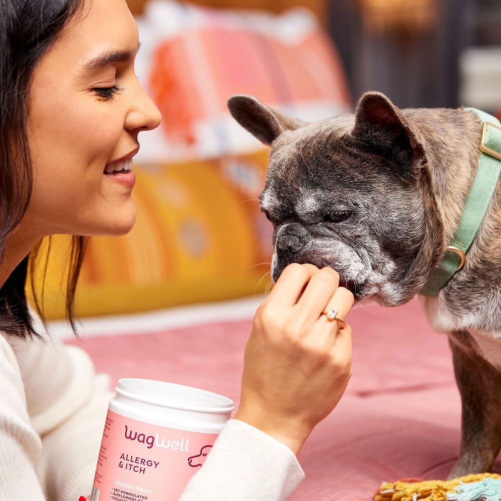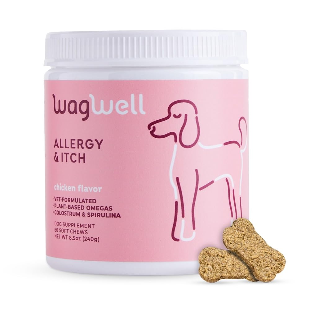 Wagwells Allergy & Itch Chews are specially formulated to enhance histamine response to reduce your dogs itching, skin irritation, red eyes, and sneezing from seasonal or year-round allergies. These chicken-flavored pet allergy chews can help keep dogs happy and healthy during the dreaded allergy season. There are 60 soft dog itch relief chews in one 8.5-oz. jar, and each one is packed with Colostrum, Ahiflower (Buglossoides arvensis), Epicor, Organic Echinacea, L-Glutathione, Spirulina, and D-Biotin. This chicken-flavored chew is an allergy-relief chew for dogs of all ages, stages, and sizes. Along with providing itch and allergy relief, chews support a dogs gut health and immune system. Caregivers can give these allergy bites for dogs at meal time or as a tasty treat. Give one vet-formulated, four-gram chew to dogs under 25 pounds, two anti-itch chews for dogs 26 to 50 pounds, 2.5 chews for dogs 51 to 75 pounds, and three chews for dogs over 75 pounds. These bone-shaped allergy and immune chews for dogs are an essential supplement to a dogs daily diet. Easily add Colostrum and Spirulina to your dogs meals in a tasty, chicken-flavored allergy supplement treat. Wagwells Allergy & Itch Chews are a daily essential that your dog will love, so youll feel better too!