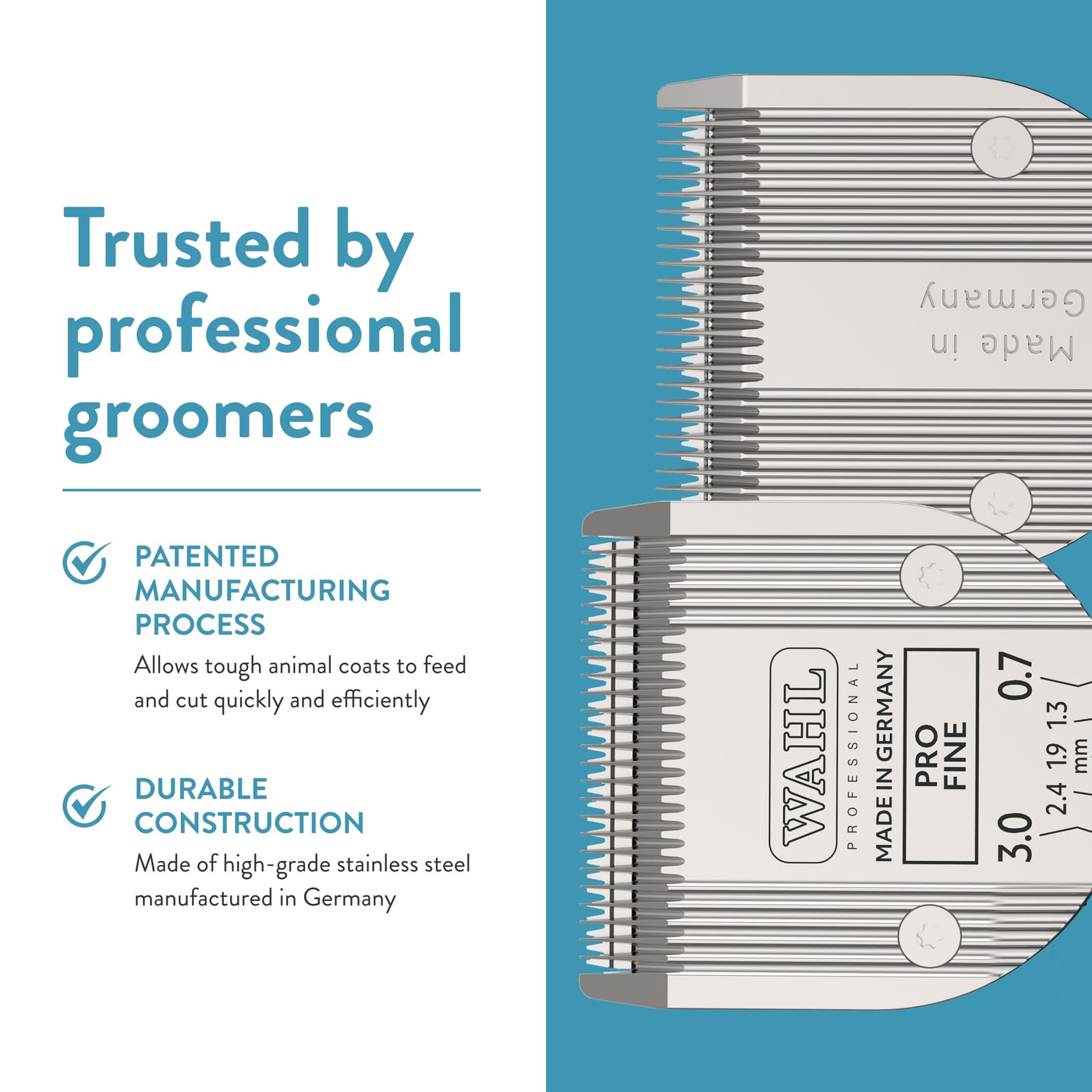 Fits Wahl Professional Animal's Arco, Bravura, Chromado, Creativa, Figura, and Motion cordless animal clippers for trimming and grooming dogs, cats, horses, livestock, and other animals Adjustable to sizes #9, #10, #15, #30, #40 offer an all-in-one, easy-to-adjust blade that's perfect to clip, trim, and groom your pet. Made in Germany of high-grade stainless steel, Wahl blades are built to perform while you're grooming, clipping, or trimming your animal. Measures 1. 25 by 1. 5 by 0. 5 inches; weighs 0. 069 ounces. Superior tooth geometry and blade technology stay cool in use and eliminate the risk of overheated blades. Backed by Wahl's 30-day satisfaction . Wahl performs quality assurance on all of our products and small bits of synthetic hair may appear on the blade or clipper as a result of this process. Rest assured that your clipper and blade are brand new.