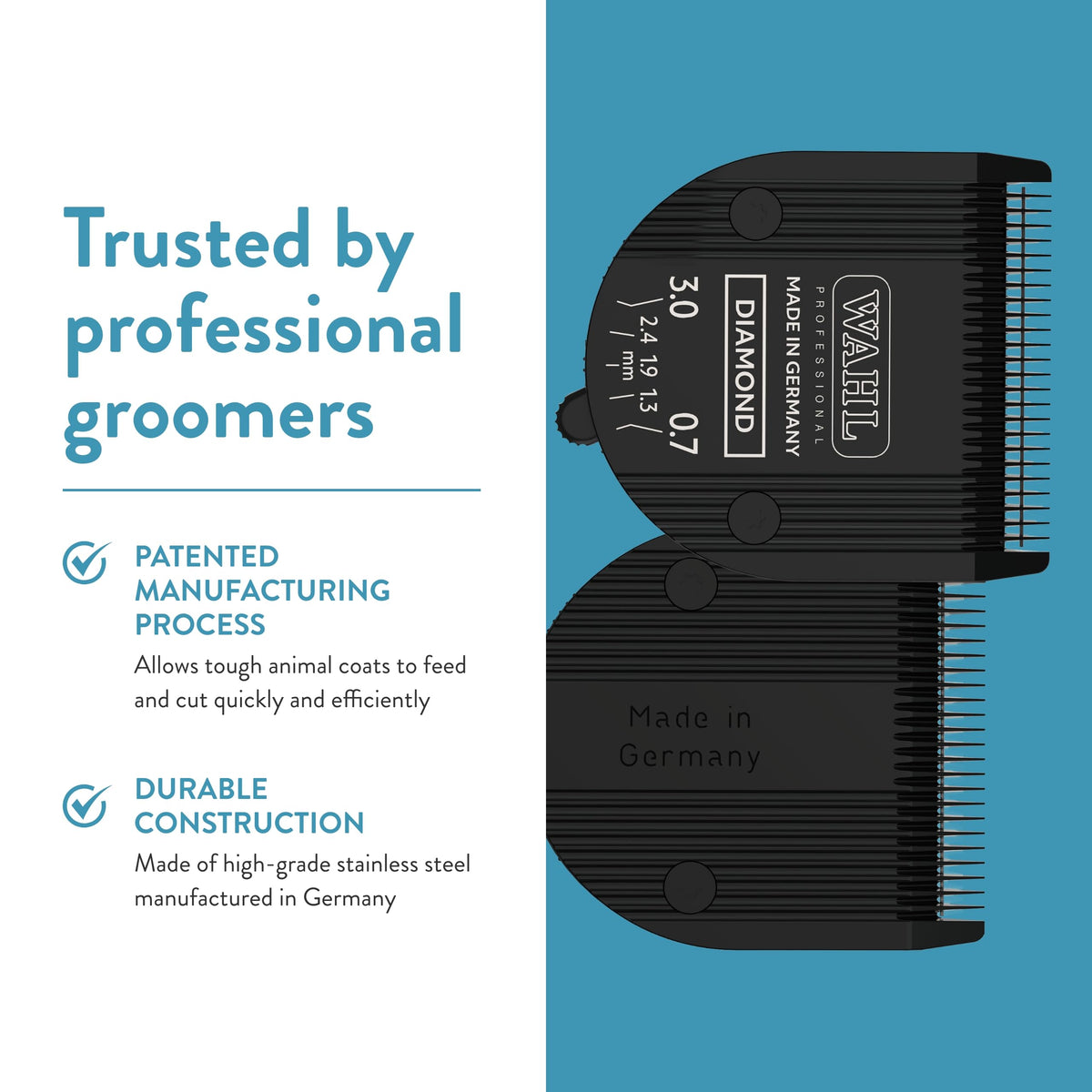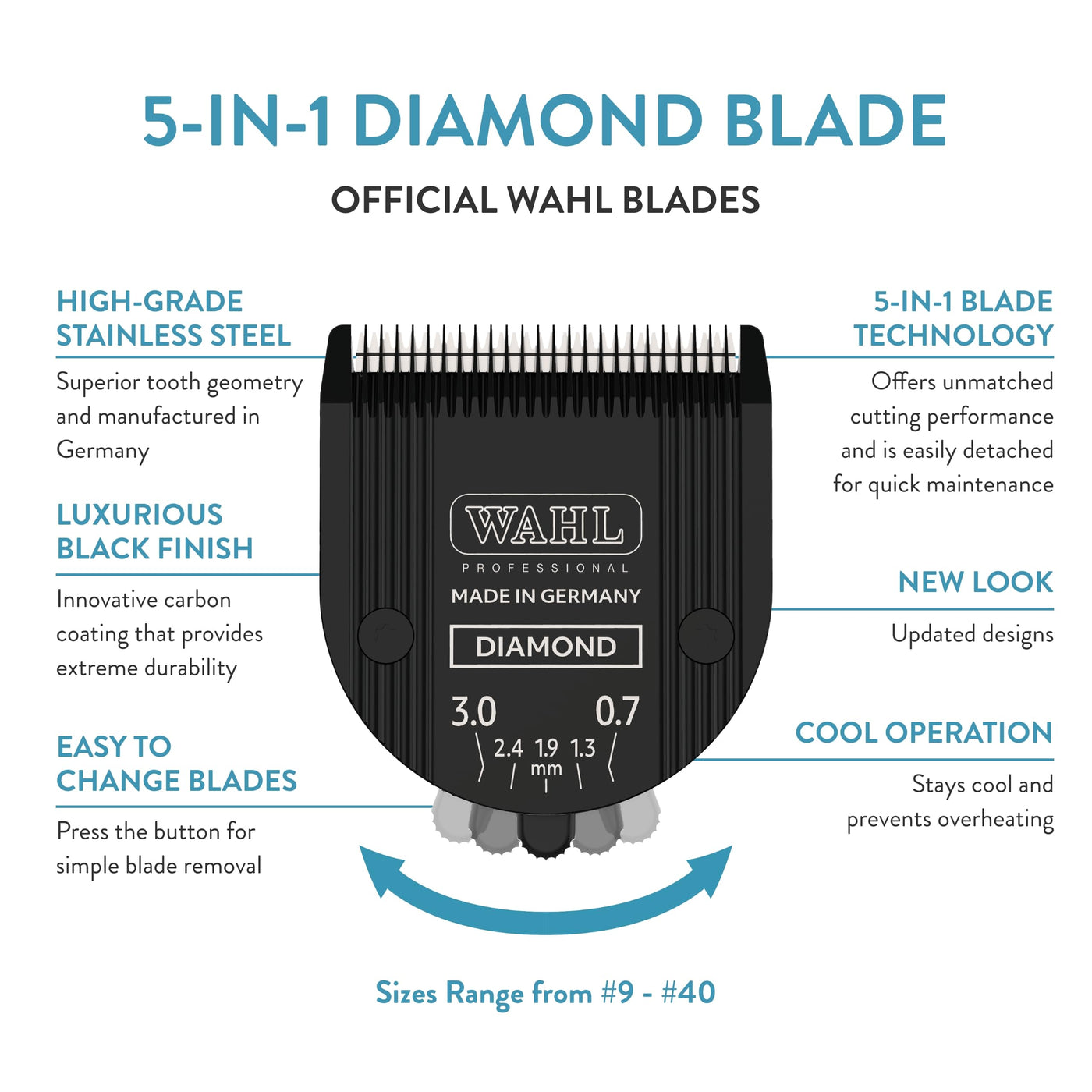 Premium Clipper Replacement Blade: The 5-in-1 Diamond Blade is designed to fit Wahl's Arco, 5 Style Groom, Bravura, Creativa, Chromado, Figura, and Motion animal clippers | Features a black DLC coating for faster feeding and durability while superior tooth geometry and blade technology stay cool while in use and help eliminate the risk of overheating | Easy to detach and adjust from sizes #9, #10, #15, #30, and #40 | Requires little maintenance and comes with an increased service life; backed by Wahl's 30-day satisfaction guarantee | Wahl performs quality assurance on all of our products and small bits of synthetic hair may appear on the blade or clipper as a result of this process; Rest assured that your clipper and blade are brand new