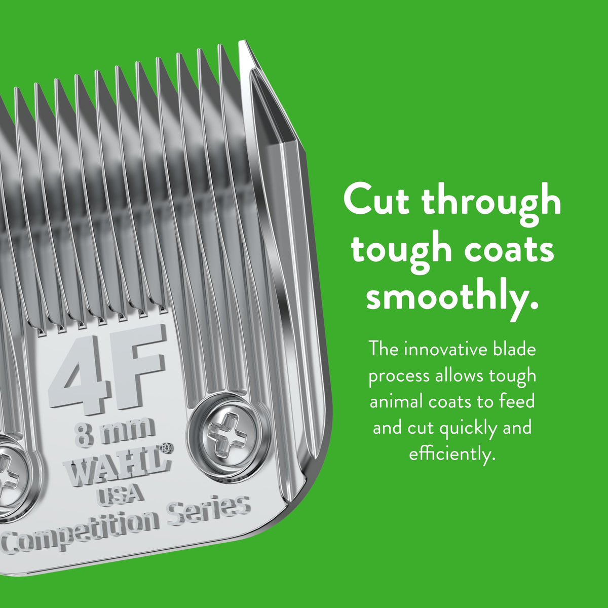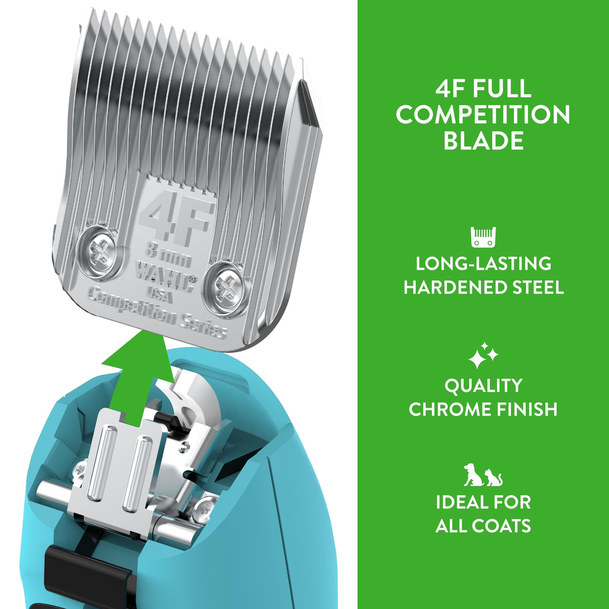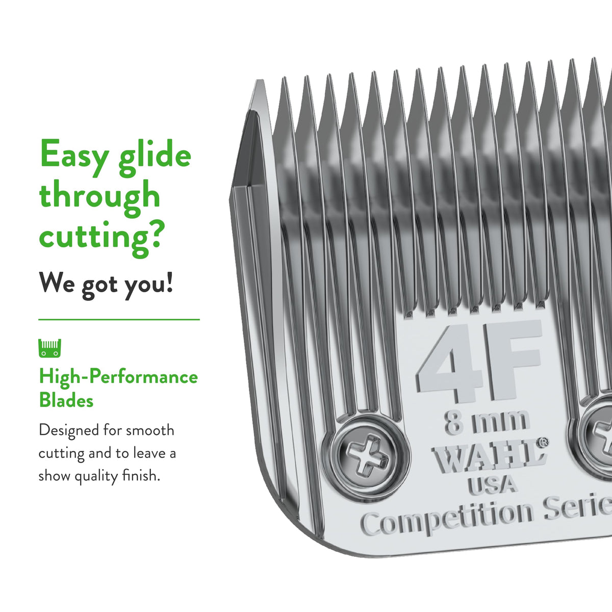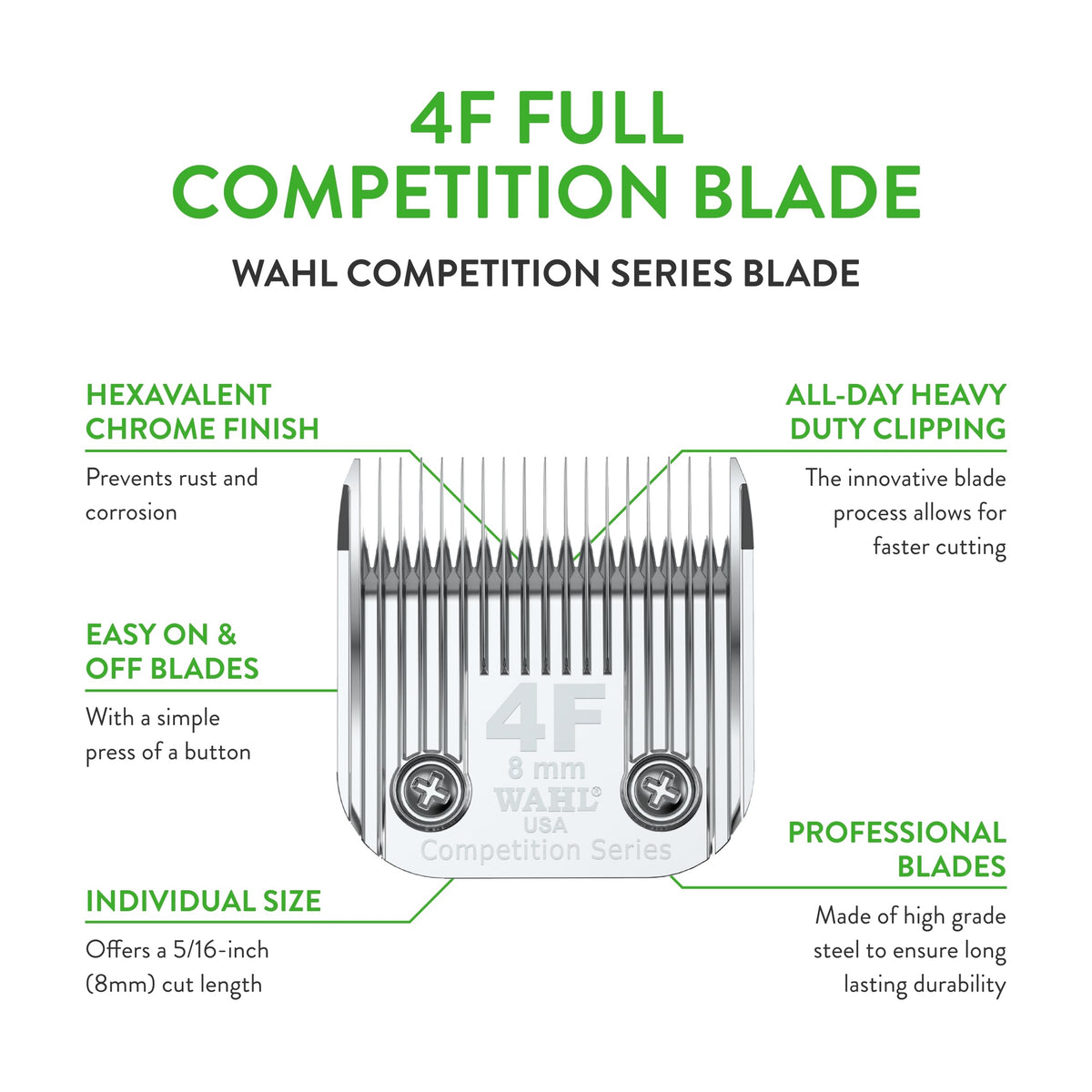 Replacement Blade: Providing a smooth cut and show-quality finish for pets and livestock, the full extra coarse #4F blade provides a 5/16-inch (8mm) cut length | Ideal for a smooth cut and show-quality finish for all animal coats including dogs, cats, horses, and large animals | The full extra coarse #4F blade provides a 5/16-inch (8mm) cut length; a professional quality chrome finish provides superior rust and corrosion protection | Made in the USA; includes one Competition Series detachable blade Backed by Wahl's 30-day satisfaction guarantee | Wahl performs quality assurance on all of our products and small bits of synthetic hair may appear on the blade or clipper as a result of this process; Rest assured that your clipper and blade are brand new