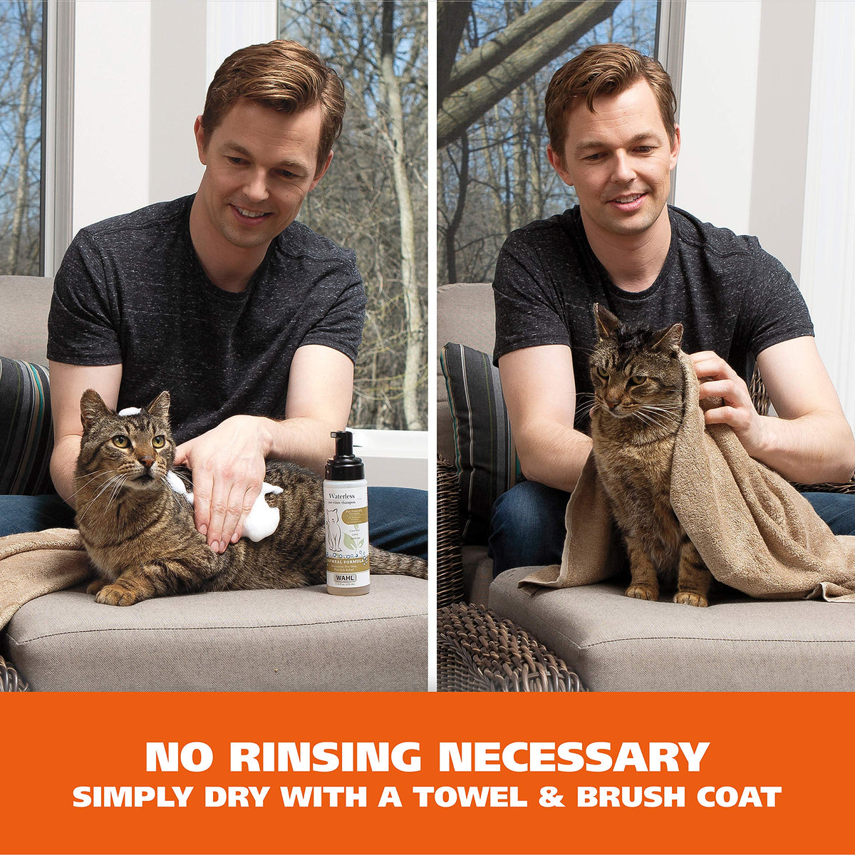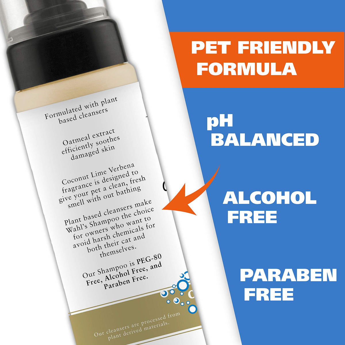 Wahl'S Cat No-Rinse Waterless Shampoo Is Formulated With All-Natural Plant-Derived Ingredients. For Best Results, Simply Use One Pump Of The Waterless Shampoo For The Entire Bath, Comb Your Cat, And Then Dry It Completely. The Waterless Shampoo Is Meant To Be Used Between Shampoos And Baths. Our Oatmeal Extract Quickly And Efficiently Soothes Damaged Skin. Our Oatmeal Formula Features A Coconut Lime Verbena Fragrance That Is Designed To Give Your Pet A Clean, Fresh Smell Without Bathing. We Also Have Included A Unique Foam Applicator. While There Are No Harmful Chemicals In Our Pet Products, Some Pets Are Sensitive To Certain Plant Oils Used In Our Products. Wahl Strongly Recommends Talking To Your Vet And Doing A Small Spot Test On Your Pet At Least 24 Hours Before Using Any New Product. Product In Packaging May Not Be Exactly The Same As The Photo Due To Continuous Improvements To The Product.