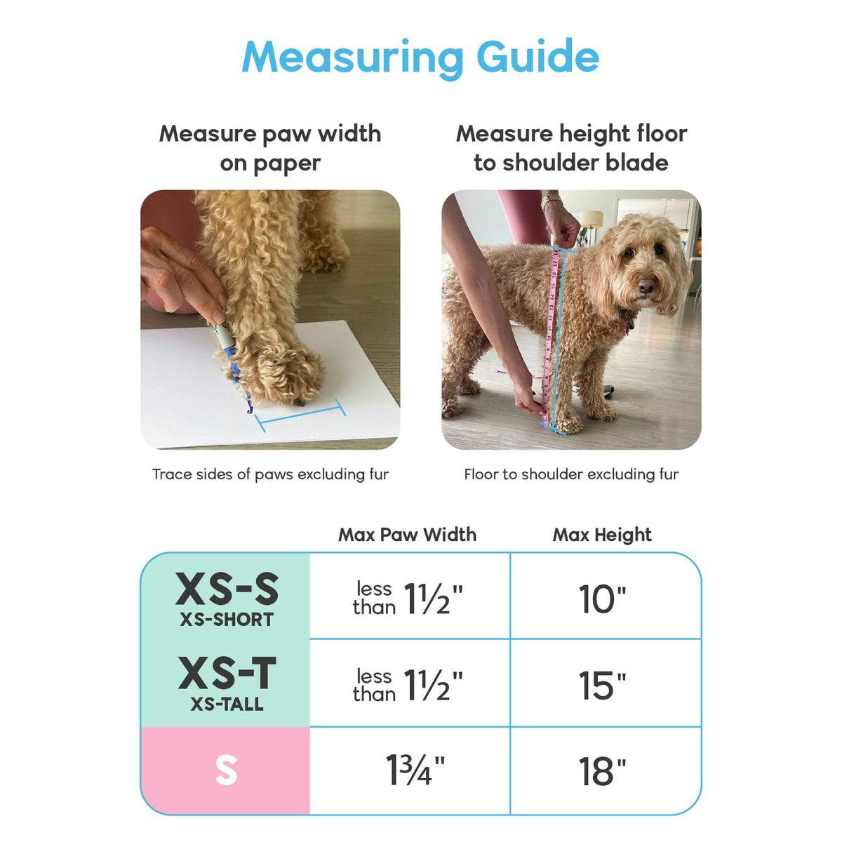 Q: Are Walkee Paws suitable for all dog sizes?A: Walkee Paws are specifically designed for small to medium-sized dogs. They come in various sizes, including Extra Small Short, to ensure a comfortable fit for your dog. Be sure to measure your dog's leg height and back length for the best fit.