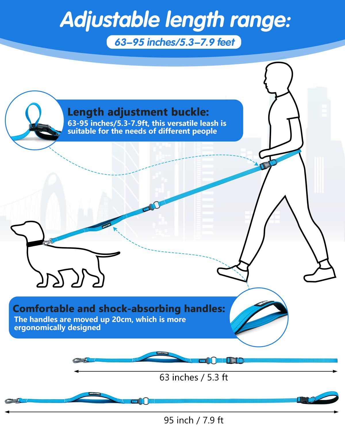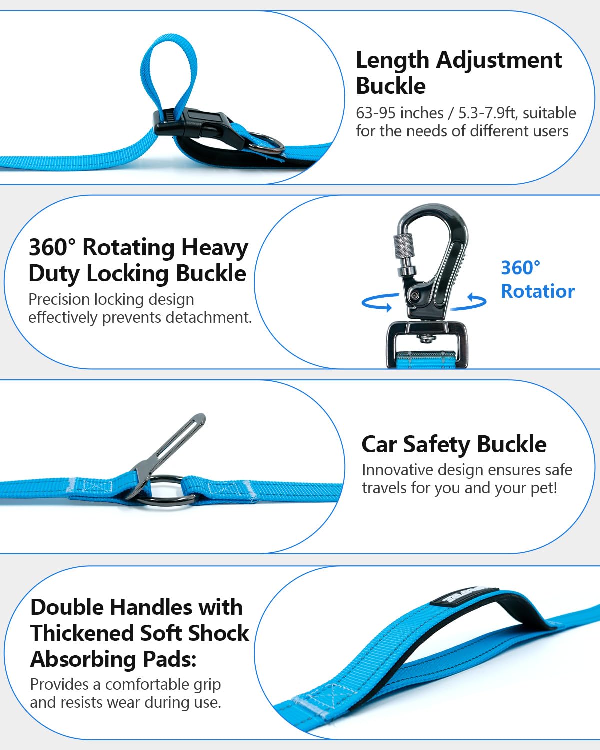 ?????Hands Free Dog Leash?The Dog Leash Length Ranges From 5.3-7.8Ft (63-95 Inches), And The Dog Leash Can Be Replaced With ''Crossbody Dog Leash, Waist Dog Leash Or Handheld Dog Leash'' According To Your Needs. Flexible Functional Changes Can Enhance Various Interactions Between You And Your Pet. ?????Heavy-Duty Waist Dog Belt?The Weight Of The Dog Leash Is About 260G, Which Can Support Dog Weights Up To 110Lbs/50Kg. Made Of Nylon And Polyester Fibers, It Has High-Strength Tear Resistance And Long-Lasting Durability. The 360 Rotating Lock Is Made Of Aerospace Aluminum Alloy To Prevent Breakage. The Maximum Tensile Strength Is 380Kg, Ensuring Freedom Of Movement While Preventing The Risk Of Leash Breakage And Losing The Dog. ???? ?Comfortable Double-Handle Design?Both Handles Feature Soft Neoprene Foam Padding, Reducing Strain On Your Waist And Hands. Ideal For Active Dogs, The Leash Absorbs Shocks And Impacts, Offering Maximum Comfort Even During Long Walks Or Runs. ?????Car Safety Buckle Dog Leash?Equipped With A Car Safety Buckle, This Leash Easily Connects To Your Cars Seatbelt Socket. It Keeps Your Dog Secure And Stable During Car Rides, Reducing Travel Anxiety And Ensuring Pet Safety On The Go. ?????Reflective Dog Leash For Night Safety?Featuring Double-Sided Reflective Tape, This Leash Enhances Visibility In Low-Light Conditions. Whether You'Re Out For A Night Run, An Early Morning Walk, Or An Evening Stroll, It Provides An Extra Layer Of Safety For You And Your Dog. ???100% Customer Service?Product: Black Dog Leash*1, We Are Committed To The Happiness Of You And Your Pet. If You Have Any Questions, Please Let Us Know And We Will Solve Them For You As Soon As Possible.