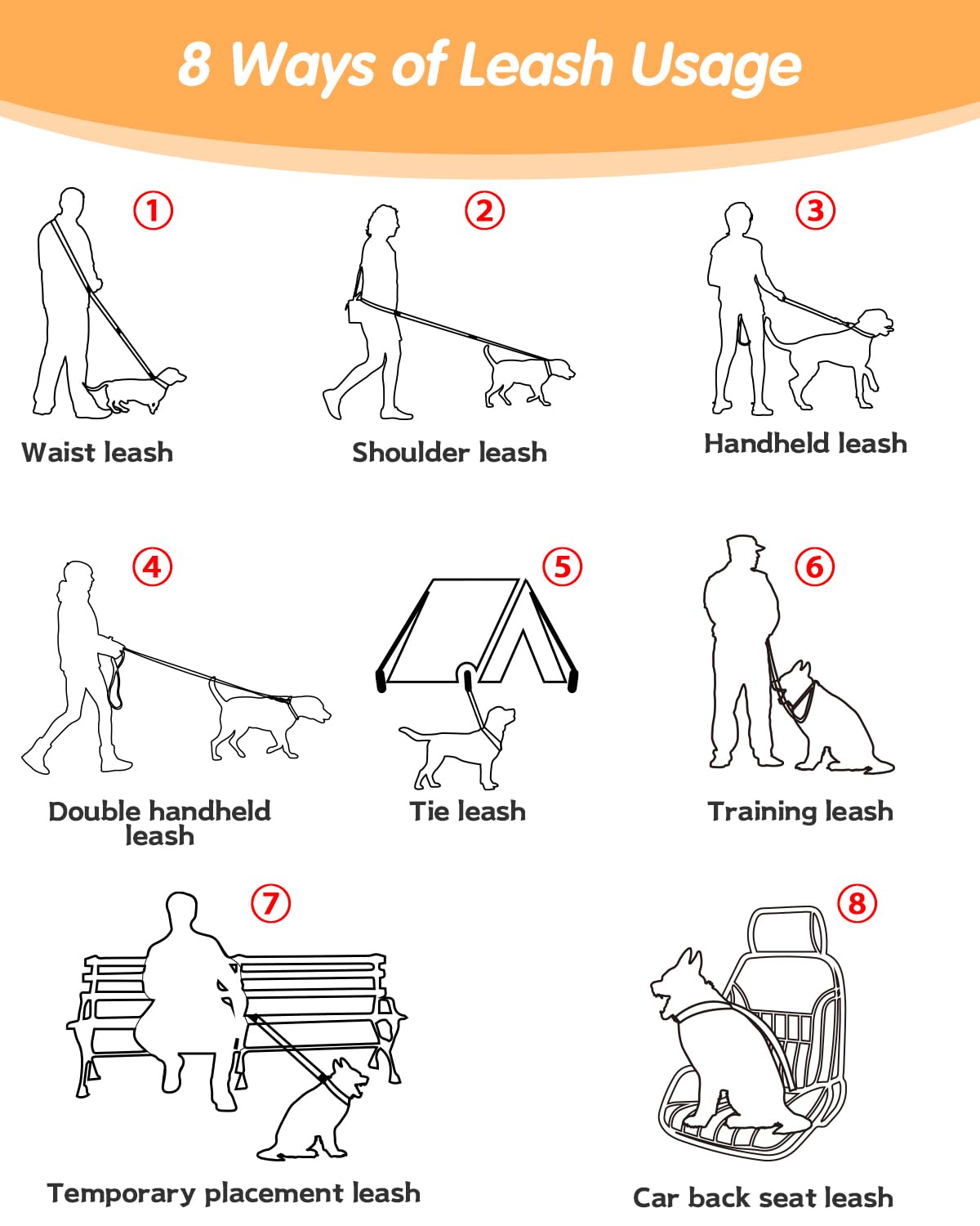 ?Multifunctional Adjustable Dog Leash?The Dog Leash Is From 5.9 Feet -9.5 Feet In Length And Includes Two Adjustment Buckles For Adjustment To The Desired Length. The Leash Can Be Used As A Shoulder Strap, Waist Belt Or Handheld Leash. Its Adjustable Length Is Suitable For People Of Different Heights And Weights, Enhancing The Diversity Of Interaction Between You And Your Pet.
