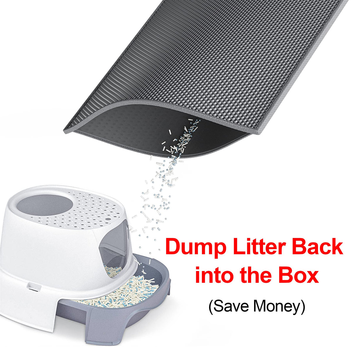 High Quality EVA Material- 24 'x 15' Cat litter mat is made of high quality and environmentally friendly EVA foamed rubber material, phthalate free, the material is soft and environmentally friendly, won't cause any harm to your cat. The soft litter box mat can protect your cat's paws, so your cat will love the feeling of stepping on it, and can also be used as a cat scratching mat. Honeycomb Double Layer Design -The litter trapping mat consists of two layers. The large 10mm honeycomb holes in the kitty litter mat top layer can trap and lock the litter doubly effectively, and the litter is sifted and gathered in the leak-proof layer at the bottom, preventing the litter from being dragged or scattered on the floor. Waterproof / Urineproof / Anti-slip -The bottom layer of the cat litter box mat is waterproof and urineproof, so you don't have to worry about odours and liquids seeping out of your floor. The cat litter mat large protects your floor and carpet from urine stains. Importantly, the cat litter pads non-slip bottom layer ensures that your cat won't slip when jumping out of the litter tray or walking. Easy to Clean & Washable-The litter mats is made of soft, resistant and washable EVA, you can rinse the cat rug for litter box directly under faucets and shower heads, the dirt is easy to remove and dries quickly. You don't have to sweep or vacuum the litter every day, saving you time and effort. Easy to Use- Place cat litter catcher mat under the litter box, when your cat leaves the litter box, the litter stuck to the paws will be captured by the kitty litter mat trapper large honeycomb holes on the surface, you just need to pick up the cat mat for litter and gently shake it, the litter will come off easily, pour the litter back into the litter box for reuse and reduce the waste of cat litter. Waterproof cat litter mat is suitable for all types of cat litter and litter boxes.
