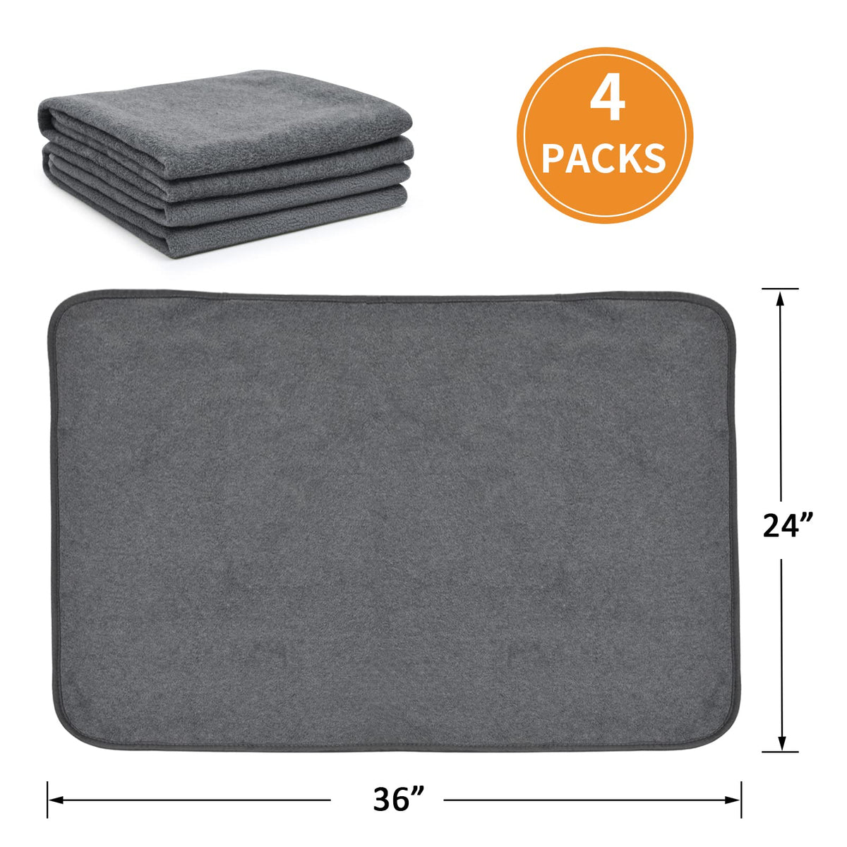 Q: What size are the washable pee pads and how many come in a pack?A: Each washable pee pad measures 24 inches by 36 inches, and the pack contains 4 pads, providing ample coverage for training and protection.