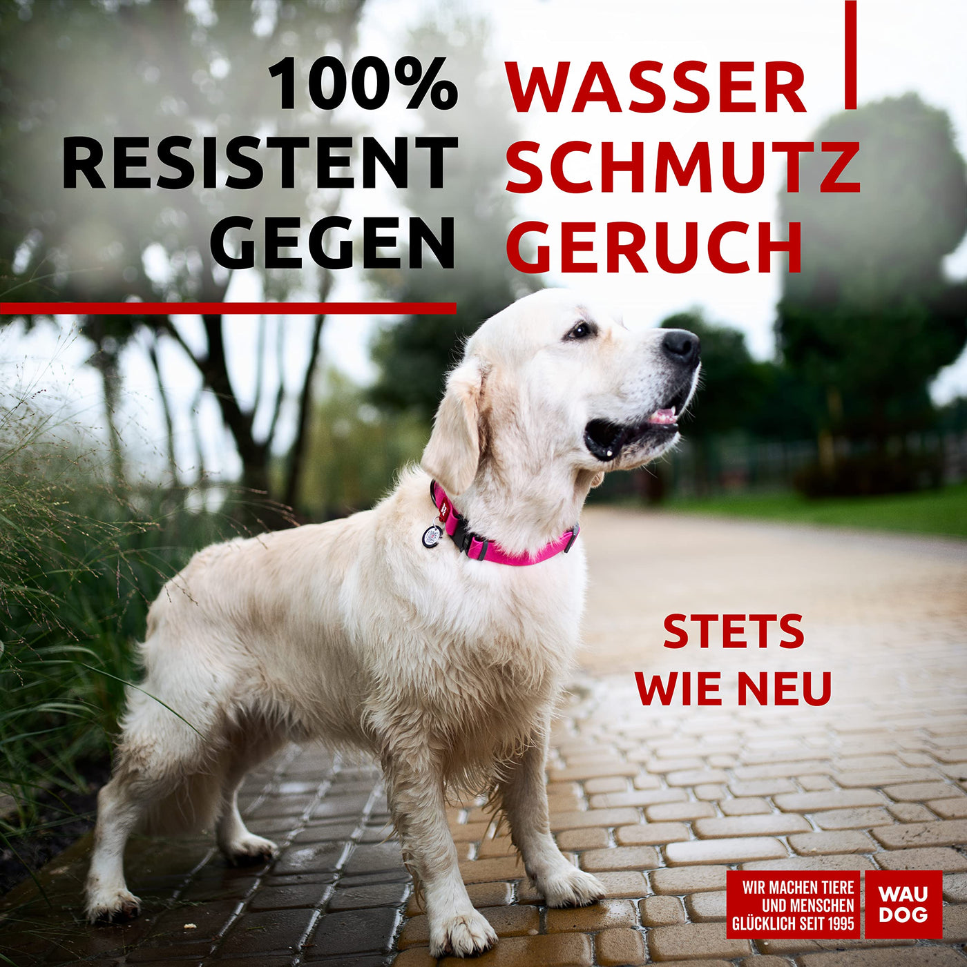 Q: Is the WAUDOG Waterproof Dog Collar suitable for outdoor activities?A: Yes, the WAUDOG Waterproof Dog Collar is made from COLLARTEX material, which repels water and dirt, making it ideal for outdoor activities and adventures with your pet.