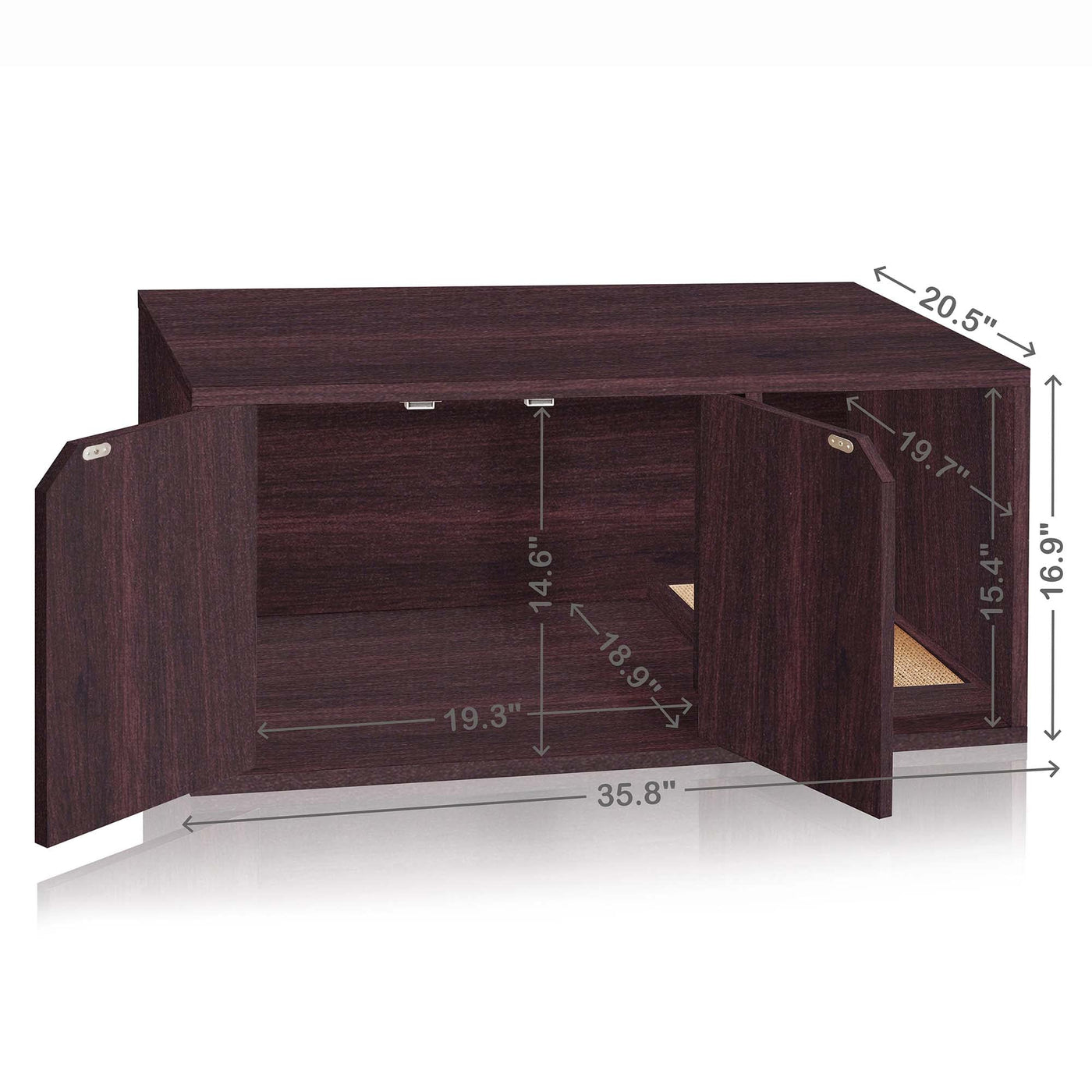 Q: What are the dimensions of the WAY BASICS Cat Litter Box Enclosure?A: The exterior dimensions of the WAY BASICS Cat Litter Box Enclosure are 20.5 inches in depth, 16.9 inches in height, and 35.8 inches in width. The interior dimensions are 19.7 inches in depth, 15.4 inches in height, and 34.3 inches in width.