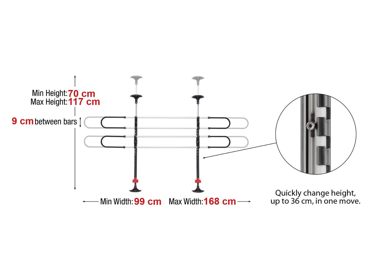 Q: What are the size adjustments for the WeatherTech Pet Barrier?A: The pet barrier adjusts to a minimum height of 30 inches and a maximum height of 46 inches. It can also be adjusted to fit a minimum width of 39 inches and a maximum width of 66 inches, making it versatile for various vehicle sizes.