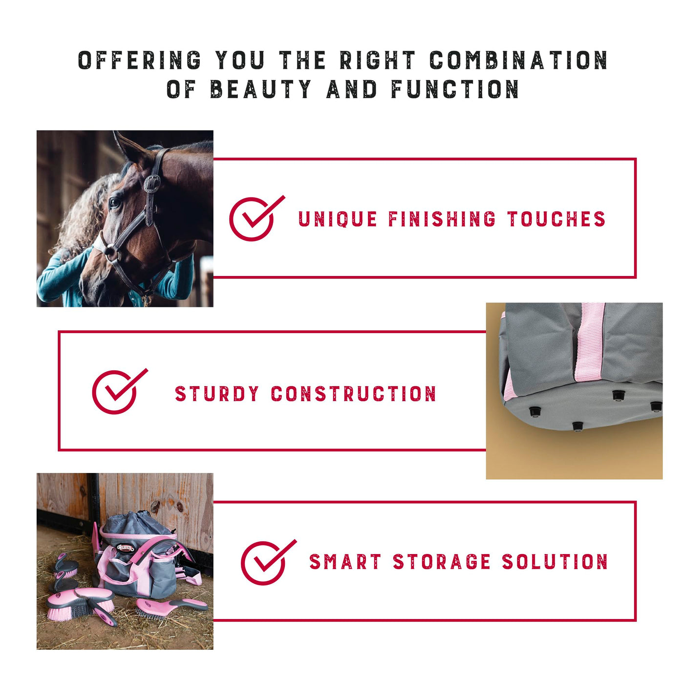 Q: How can I keep the grooming tools organized in the tote bag?A: The grooming tote bag features six outer pockets and a spacious interior, allowing you to easily organize and access all your horse grooming tools while preventing them from getting tangled.