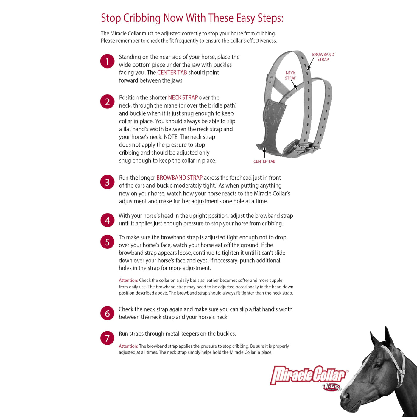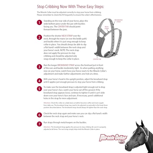 The Exclusive, Patented Miracle Collar Stops Cribbing In Seconds. Its Unique. Breeds And Disciplines From Cribbing Or Your Money Back. With Over Ten Years On The Market And Thousands Of Satisfied Users, The Miracle Collar Is One Of The Best Anti-Cribbing Devices Available. Carefully Handcrafted From Top Quality Harness Leather For Weather Resistance, Strength And Gentleness To The Hair Coat. The Collar'S Anatomically-Correct Fit Applies Pressure Only When Your Horse Attempts To Crib So It Can Be Worn While Eating, Drinking Or Grazing. Specially-Designed With A Unique Shape, The Miracle Collar Stays In Place For Maximum Effectiveness. Non-Rust Stainless Steel Hardware For Durable Performance. Includes Easy-To Follow Directions. U.S. Patents #5,343,829 And #5,460,125. Medium Size Fits Large Ponies And Average Size Horses.