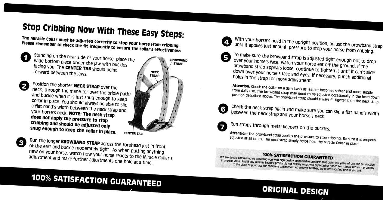 The Exclusive, Patented Miracle Collar Stops Cribbing In Seconds. Its Unique. Breeds And Disciplines From Cribbing Or Your Money Back. With Over Ten Years On The Market And Thousands Of Satisfied Users, The Miracle Collar Is One Of The Best Anti-Cribbing Devices Available. Carefully Handcrafted From Top Quality Harness Leather For Weather Resistance, Strength And Gentleness To The Hair Coat. The Collar'S Anatomically-Correct Fit Applies Pressure Only When Your Horse Attempts To Crib So It Can Be Worn While Eating, Drinking, Grazing And When Being Ridden. Specially-Designed With A Unique Shape, The Miracle Collar Stays In Place For Maximum Effectiveness. Non-Rust Stainless Steel Hardware For Durable Performance. Includes Easy-To Follow Directions. U.S. Patents #5,343,829 And #5,460,125. Large Size Fits Warm Bloods, Drafts And Large Horses.