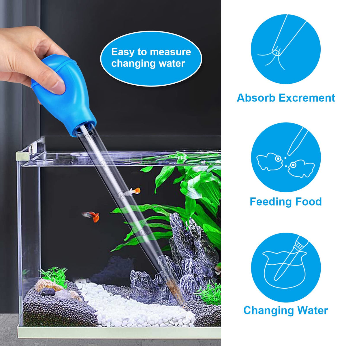 Q: How does the WEAVERBIRD Manual Fish Tank Water Changer work?A: The WEAVERBIRD Manual Fish Tank Water Changer operates by using a pipette dropper mechanism that allows you to easily suck up waste, dirt, and residual feed from the bottom of your aquarium. By controlling the strength of your grip on the dropper, you can adjust the amount of water absorbed, making it effective for both changing water and cleaning.