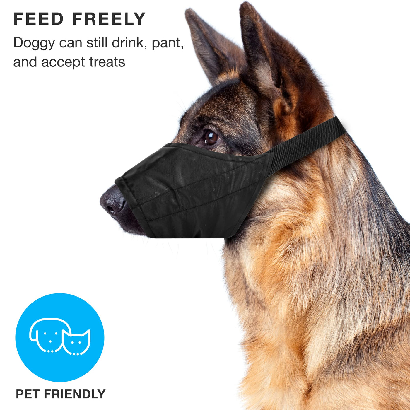 Comfortable sheath-style cloth safety muzzle designed to fit average-snouted dogs. Stop biting and nipping, discourage barking. Perfect for trips to the groomer, vet, and other public excursions for aggressive, rambunctious, or anxious dogs. Why You'll Love It: Durable, breathable, and washable nylon fabric with a quick-release buckle and adjustable neck strap. Soft, padded chafe-free piping protects your dog's tender nose! When should I use a mussler for dogs? If you have a dog that is likely to bite or bark in stressful social situations like vet or grooming trips, a puppy muzzle can be a great training tool. Large dog muzzles for grooming, large breeds like German Shepherd muzzle. However, you should not use a muzzle to simply 'fix' aggression. Your dog must be taught to be comfortable and relaxed while wearing the muzzle first, then introduce it in social, stressful situations as a tool to help your dog relax. For how long should I use a dog muzzle large breed? An ideal amount of time wearing a sheath-style cloth muzzle is no longer than 20 minutes. Slide it on prior to entering a potentially stressful situation, and remove it once it has passed. If you require a more permanent muzzle, consider leather strap or metal basket muzzles. Never leave the muzzle on while your dog is unattended, and never use the muzzle in place of training to stop destructive chewing.