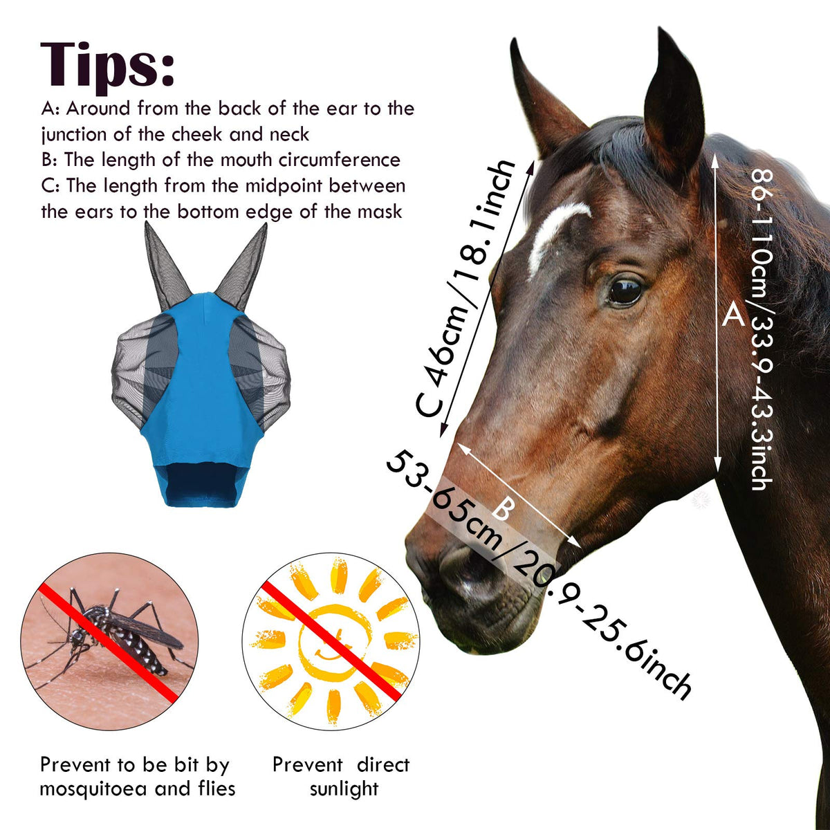 Features: Easy to wear: Horse mask overs the face from the horse s ear to the forehead, which has nice stretch ability, will not stimulate the horse, very elegant and practical. Comfortable design: The horse fly mask adopts three-dimensional cutting design, and the three-dimensional cut mesh of the eyes can prevent the horse from blinking and bruising Specifications: Material: fabric Color: as pictures shown Size: as shown in the picture Package includes: 2 x Fly horse masks Note: Due to manual measurement, please allow slight errors on size. Due to the different monitor and light effect, the actual color may be a little different from the picture s.