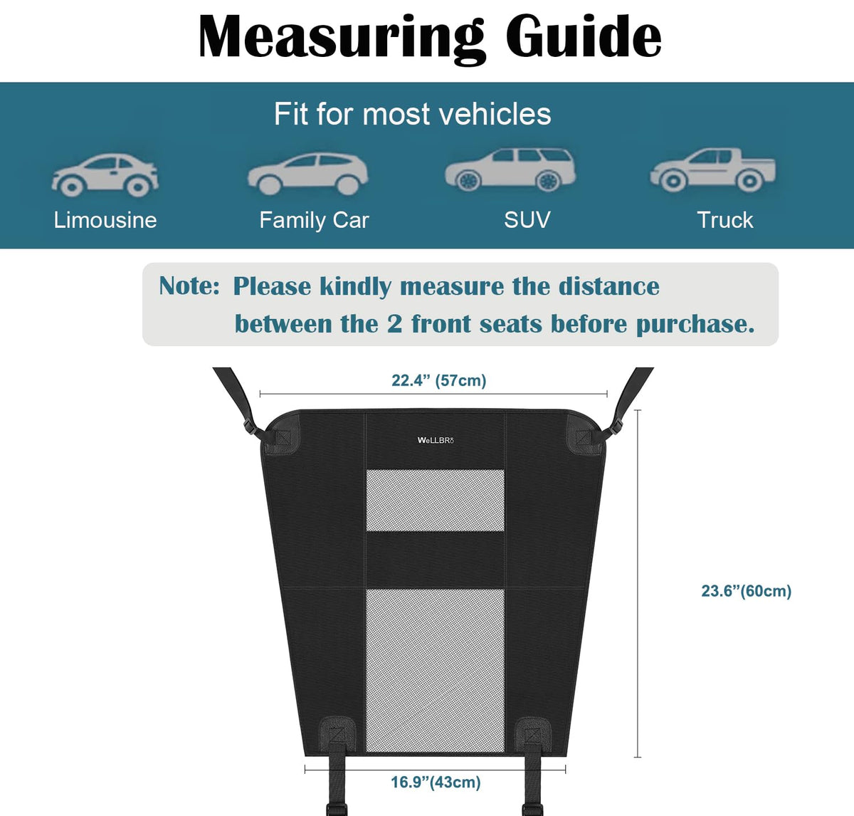 Basic Introduction Wellbro dog car barrier is especially designed for the safety driving concerns of pets, driver and passengers, which keeps the pet safely confined in the backseat while letting you focus on driving. This simple fabric pet barrier creates a soft wall between you and pets to separate your pet from the driving console. Since dogs are eager to see what's going on up at the front, he can still sit and peer through the mesh and you can even have a quick look at him if necessary. Our backseat barrier prevents your pup from nosing up between the seats, jumping where they shouldn't go, accidental fall from back to front or scratching of the console.