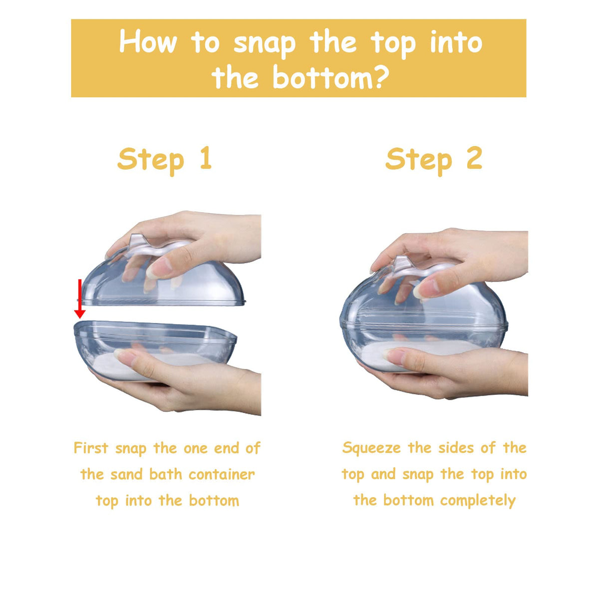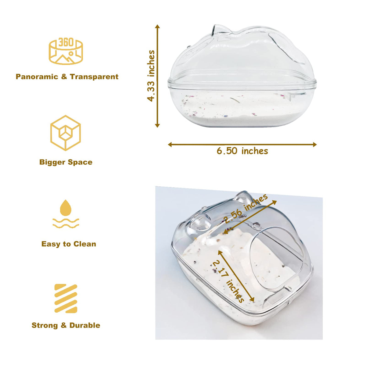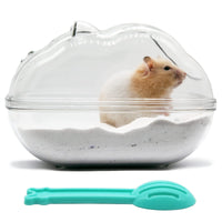 Perfect Size] The size of this hamster sand bath container is 65*43*43 inches which is big enough for your dwarf hamster Syrian hamster or other small animals Hamsters are no longer difficult to roll freely in the sand bath Avoid Kicking Sand Out] This hamster sand bath box comes with a lid and the hole is the only entrance At the same time we deepened the bottom of the sand bathtub height You dont need to worry that the hamsters kick sand out into their cage anymore Easy to clean] The lid of the hamster bathroom is very easy to open and close and it comes with a tiny scoop which can filter out the bath dust The curved design of the bottom makes it effortless to wash away dirty stuff Transparent and Visible] A clean and transparent look makes you can observe the activities of the hamster in the bathroom You can experience more of the happiness from your hamsters life You will loved it as much as your hamster High-quality material] This hamster sand bath box is strong and drop-resistant which is made of PS plastic It can resist hamster gnawing well and can accompany your hamster for a long time