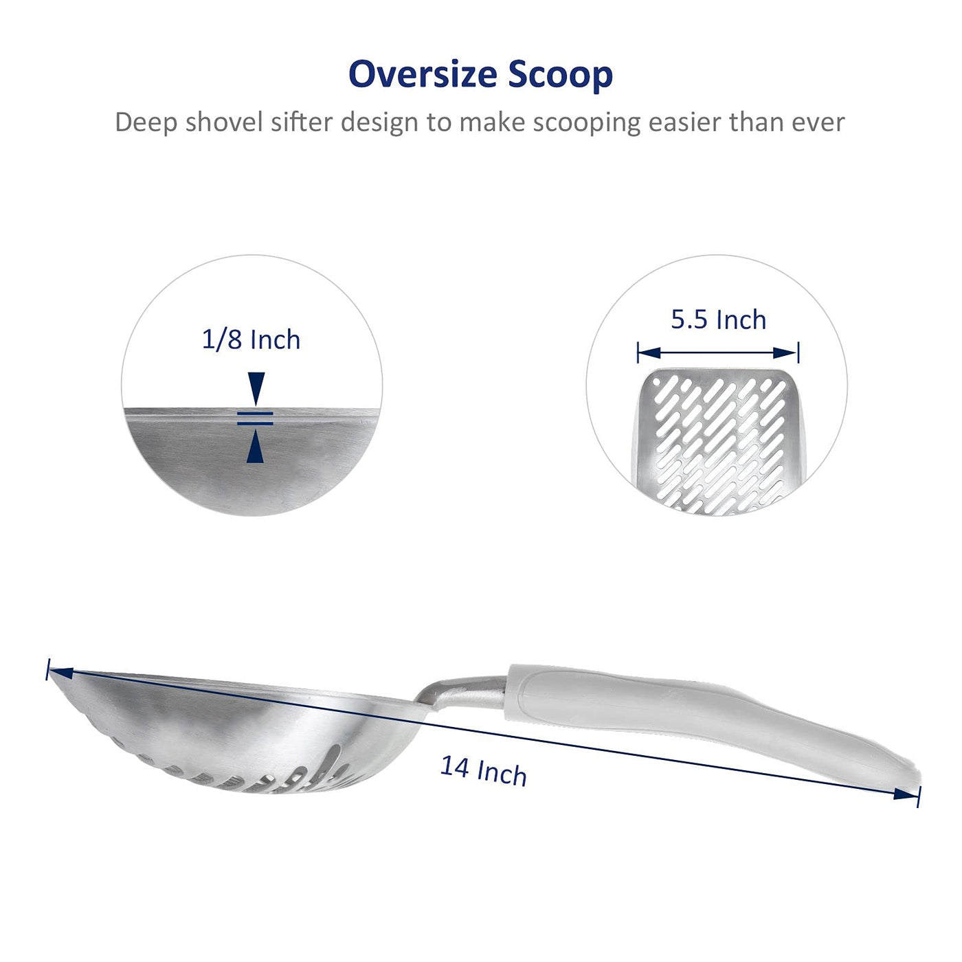 [Design]: The generous 2 inch depth with a wide mouth design, which makes your shovel so easy and simply done within 2-3 shovels. Each shovel could take up a good volume of litter and gently shake it, all the clean litter will be sifted back into the litter box and less wasting clean litter.