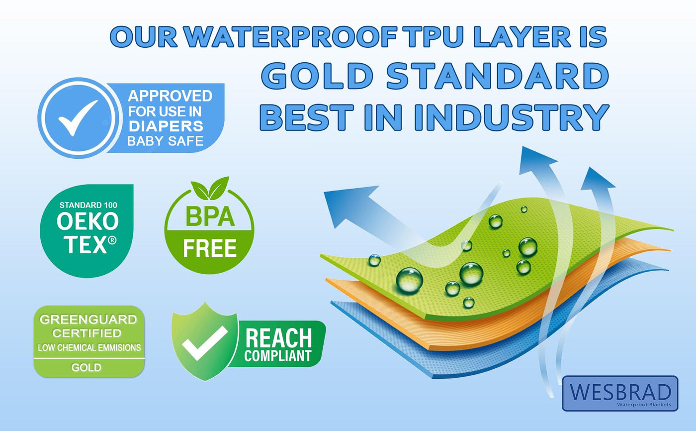 Q: What makes the WESBRAD blanket different from other waterproof blankets?A: The WESBRAD blanket stands out due to its gold standard waterproof TPU layer made from high-quality, environmentally safe material. Unlike others that use water-resistant coatings or plastic backing, our blanket offers total leak-proof protection against all liquids.