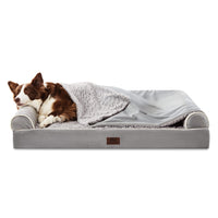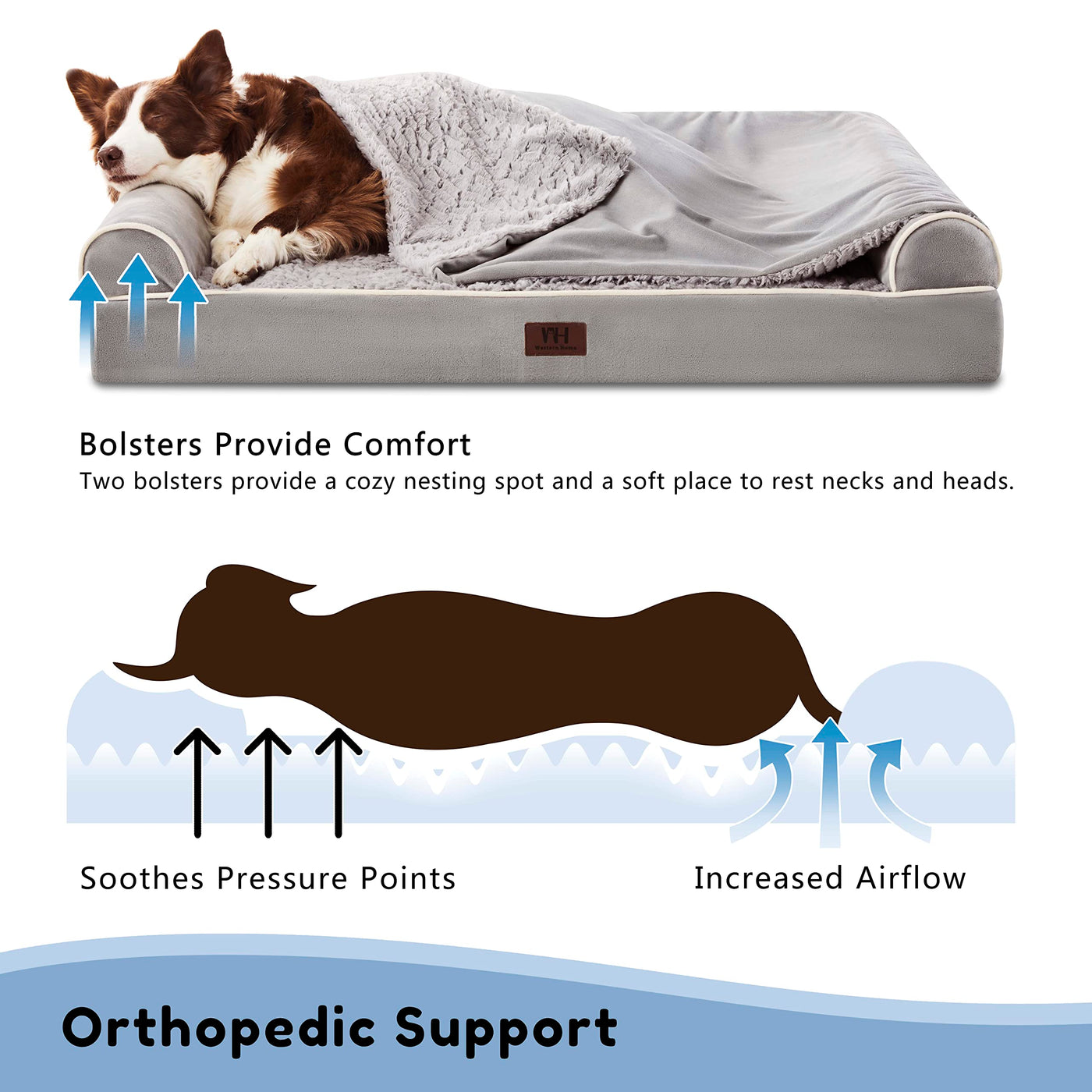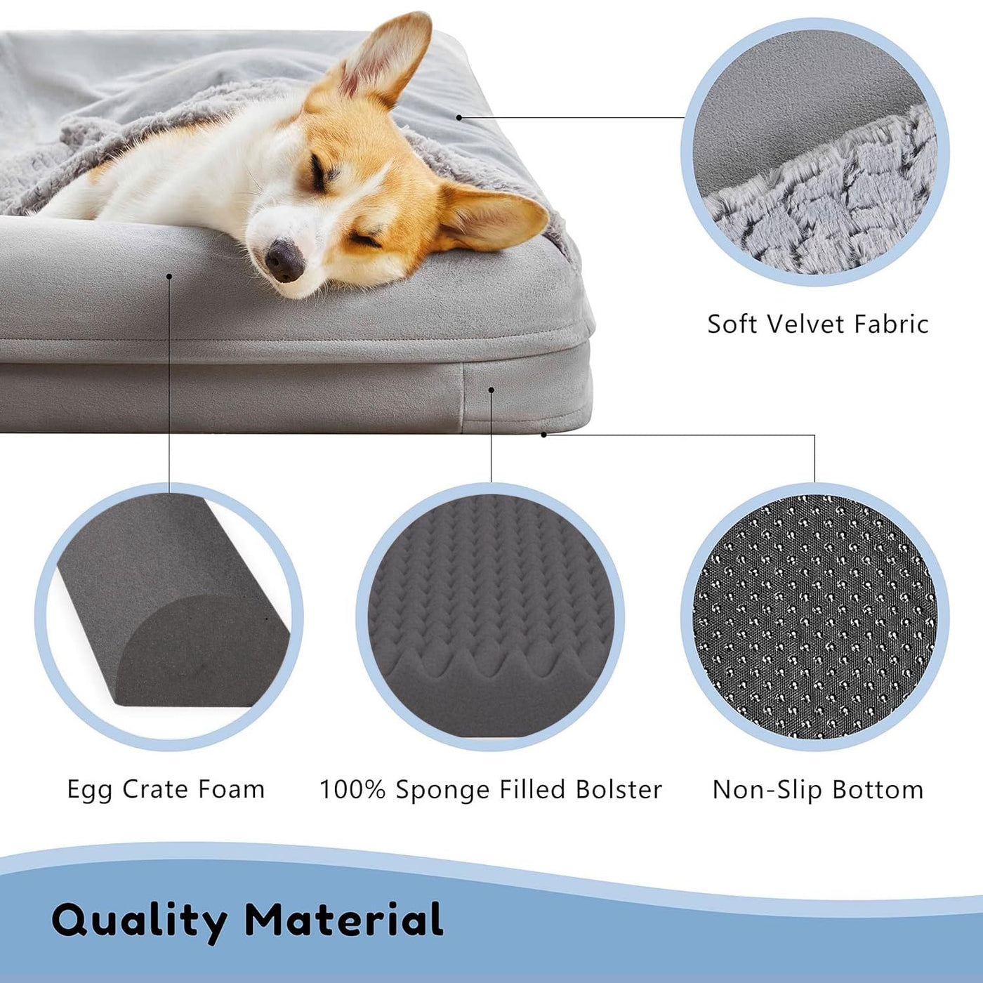 SMART DESIgNED grey Dog bed with U-shaped design promotes optimal support comfort & security for dogs to lie with their heads raised 3 sided 100% sponge filled 35 bolstered side pillow with orthopedic foam supports your puppys neck It relieves muscle tension and encourage restful sleep ADE FOR cOMFORT The 4 high-density egg crate foam orthopedic dog bed supports and relieves your fur babys muscles and joints comforts as a calming dog bed for senior dogs and dogs with arthritis who suffer from anxiety The non-slip bottom can fix the position of dog beds it brings more security to your dog SOFT SLEEP SURFAcED The sleep surface (32 X 245A) of the pet bed is made of an ultra-soft insulating fleece cover that giving your dogs plenty of room to sprawl out and sleep comfortably The materials are gentle on noses and paws WATERPROOF & EASY TO cLEAN There is no need to worry about the dog wetting the extra large dog bed because there is a waterproof layer under the plush surface of the dog couch which can prevent liquid leakage and fully protect the foam The cover of the washable dog bed be easily removed to support machine washing and low-temperature drying Og SOFA SIZE Large dog beds 36 x 27 x 65 (35 bolstered side pillow) for medium large dogs up to 55 lbs XL dog beds 42 x 30 x 75 (35 bolstered side pillow) for large extra large dogs up to 85 lbs