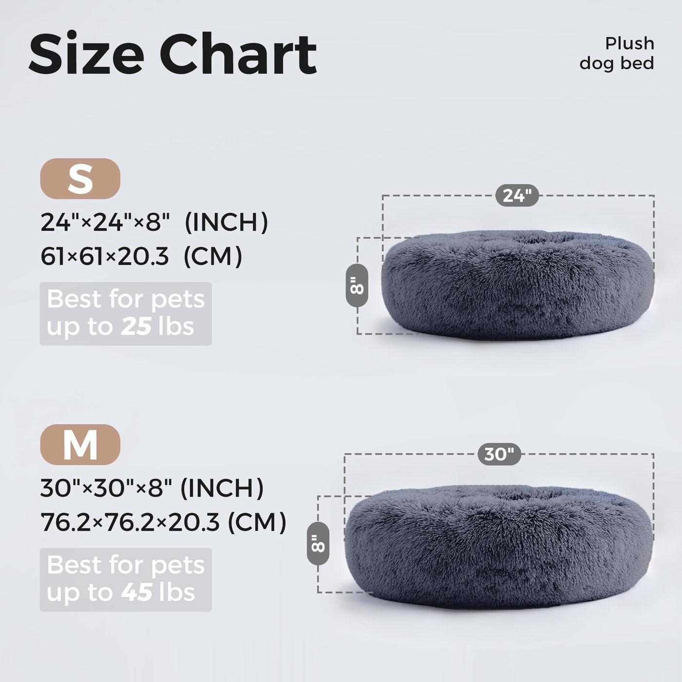 Q: What sizes are available for the WESTERN HOME WH Calming Dog & Cat Bed?A: The WESTERN HOME WH Calming Dog & Cat Bed is available in four sizes: 20 inches (suitable for small dogs up to 11 pounds), 24 inches (for dogs up to 25 pounds), 27 inches (for dogs up to 35 pounds), and 30 inches.
