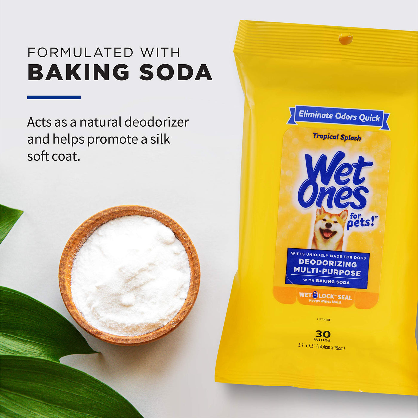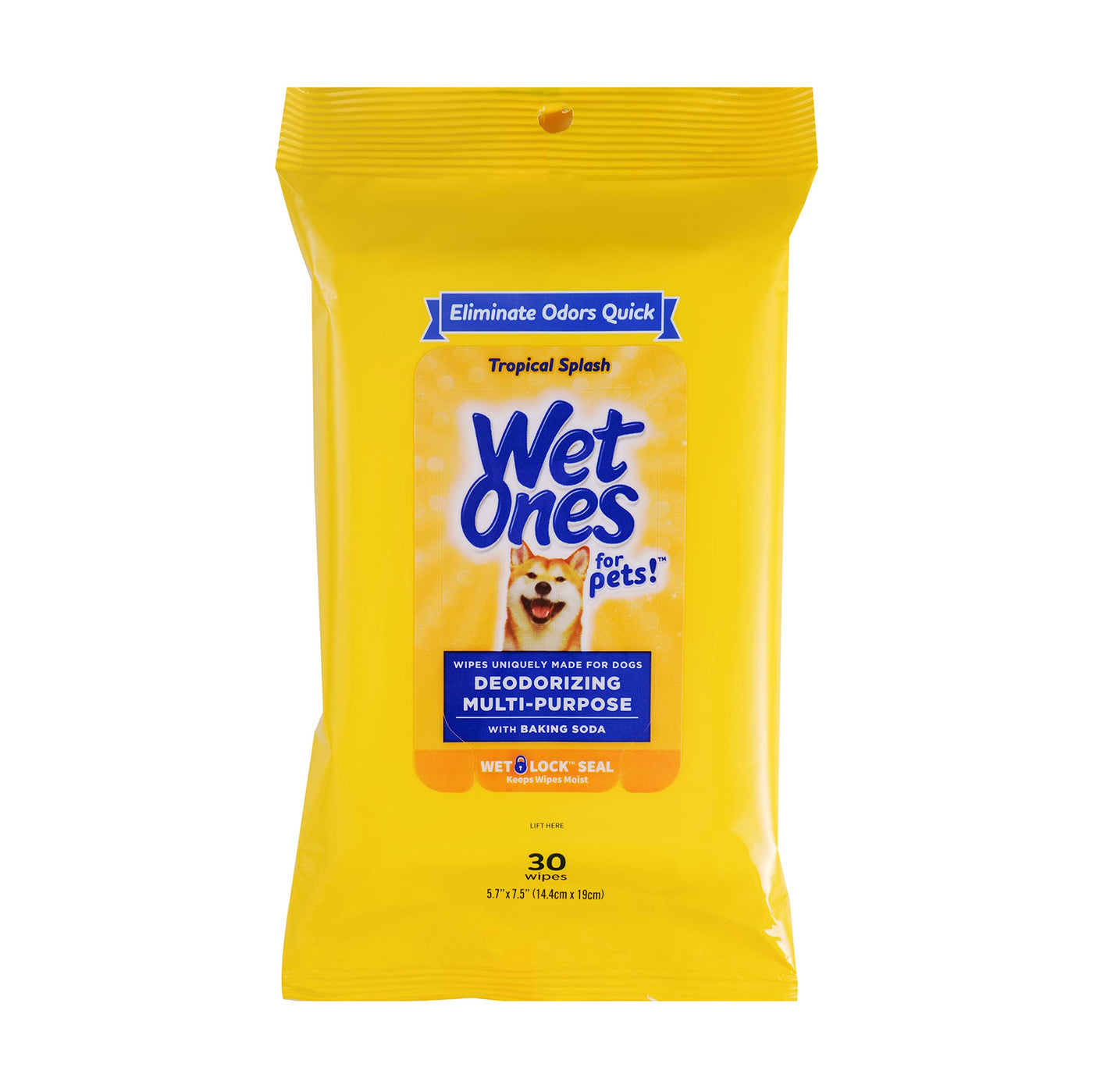 Wet Ones for Pets Deodorizing Multipurpose Wipes for Dogs are designed with your pet in mind for a quick, gentle, healthy clean anytime, anywhere Wet Ones for Pets Deodorizing Multipurpose Wipes for Dogs are a perfect solution for quick and easy clean up in between baths. These safe, easy to use deodorizing dog wipes are formulated with baking soda to act as a natural deodorizer and help promote a silky, soft coat. This variety of deodorizing dog wipes comes in a fresh Tropical Splash scent, leaving behind just a hint of a great smell that everyone can enjoy. The 30 count pouch comes with a Wet Lock seal to maintain freshness. Made specifically for pets and safe for use after outdoor playtime or indoors, these Wet Ones deodorizing dog wipes keep and your home clean and smelling fresh. Directions:1. Remove wipe from pouch and reseal to maintain freshness.2. Wipe down dog from back of neck to tail, carefully avoiding the eyes.3. Dispose of wipe in trash, do not flush.4. Play onIngredients: Water, PEG-7 Glyceryl Cocoate, Aloe Barbadensis Leaf Juice, Sodium Benzoate, Retinyl Palmitate Vitamin A, Tocopheryl Acetate Vitamin E, Polysorbate 20, Sodium Bicarbonate Baking Soda, FragranceWARNINGS: For external use only. Safe for dogs 8 weeks of age and older. Avoid contact with eyes. Keep out of reach of children. YOUR SATISFACTION IS OUR PRIORITY: If you have any questions or feedback, please reach out to us at info@fetch4petsWET ONES is a trademark of Edgewell Personal Care Brands, LLC and is used under license. 2020 Edgewell.WET ONES and WET LOCK are trademarks of Edgewell Personal Care Brands, LLC and are used under license. 2020 Edgewell.