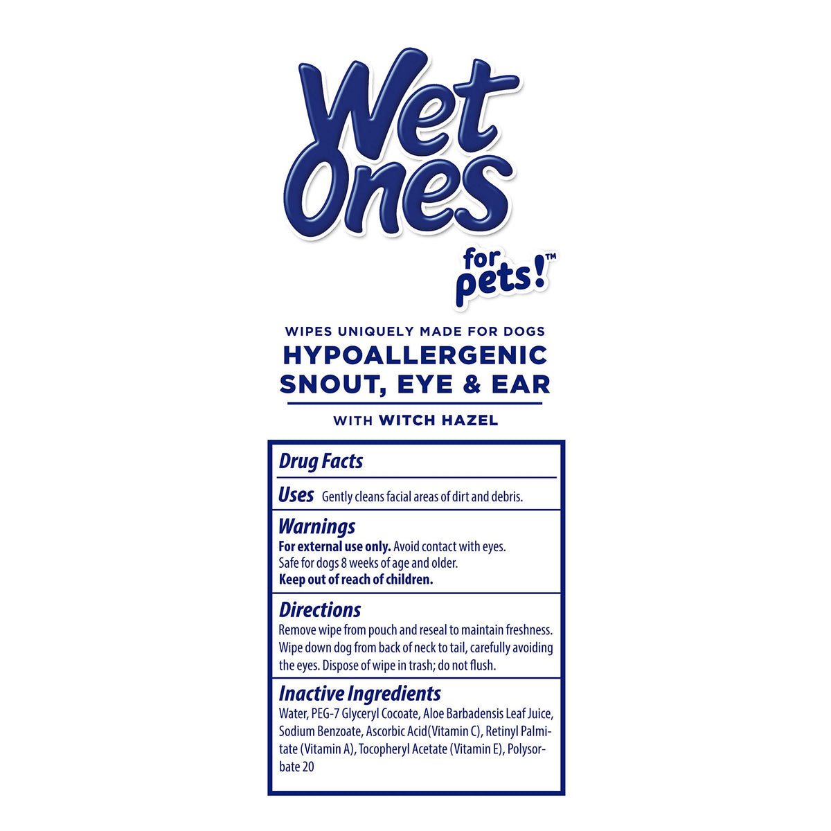 Wet Ones for Pets Hypoallergenic Snout, Eye, & Ear Wipes for Dogs are designed with your pet in mind for a quick, gentle, & healthy clean anytime, anywhere! These hypoallergenic wipes for dogs are a fragrance-free way to keep your pet comfortable and clean. The wipes for dogs are non-irritating, making them great for dogs with sensitive skin. They are dog ear wipes and dog eye wipes that gently remove dirt, tear stains, and wax buil-up in sensitive areas. The soft, gentle wipes are perfect every day to keep your pet's ears, snout and eyes healthy. Soft and moist wipes for dogs' faces and ears is a must in any dog owner's must-have pet products list. These safe, easy to use hypoallergenic dog wipes are formulated with witch hazel to naturally soothe skin and help maintain a healthy, shiny coat . The 30 count pouch comes with a Wet Lock seal to maintain freshness. Made specifically for pets and safe for use after outdoor playtime or indoors, these Wet Ones wipes keep and your home clean and smelling fresh. Directions:1. Remove wipe from pouch and reseal to maintain freshness.2. Gently wipe dog’s nose, eyes to clean away debris. When cleaning ears, only wipe the visible areas never entering the canal.3. Dispose of wipe in trash, do not flush.4. Play on!Ingredients: Water, PEG-7 Glyceryl Cocoate, Aloe Barbadensis Leaf Juice, Sodium Benzoate, Retinyl Palmitate (Vitamin A), Tocopheryl Acetate (Vitamin E), Polysorbate 20, Witch Hazel, FragranceWARNINGS: For external use only. Safe for dogs 8 weeks of age and older. Avoid contact with eyes. Keep out of reach of children.