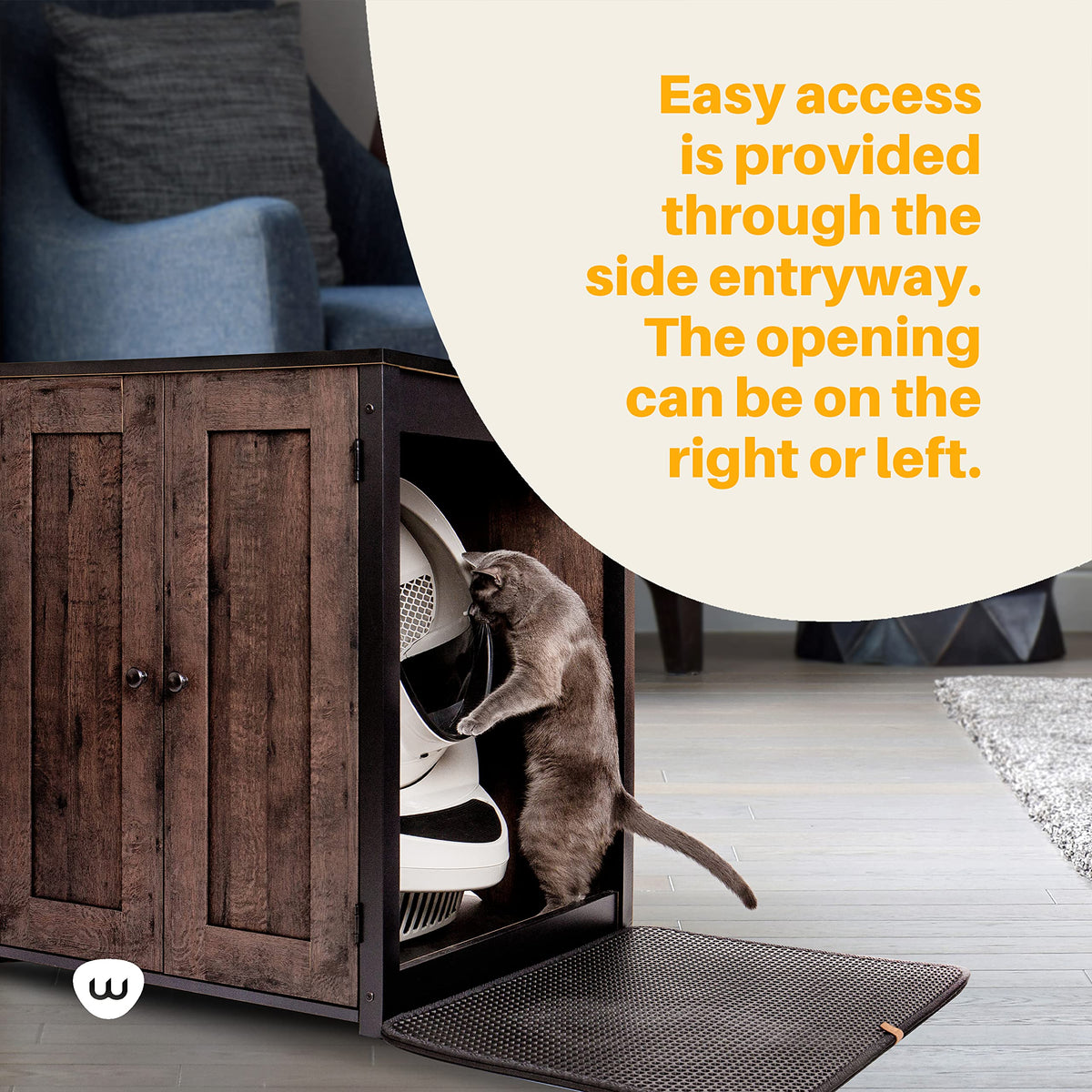 Keep Your Cat Happy And Your Home Stylish With This Storage Cabinet Cat Litter Box Enclosure By Whisker - The Maker Of Litter-Robot. Made From Durable Composite Wood With A Coffee Oak Finish, This Enclosed Litter Box Furniture Is Perfect For Hiding Your Litter-Robot - The Automatic, Self-Cleaning Litter Box - Or A Large Conventional Litter Box While Offering Easy Access To Your Feline Friend Through The Interchangeable, Open Side Entryway. Ideal For A Hidden Cat Litter Box While Still Making Use Of The Space. This Thoughtfully Designed Litter Box Furniture Features A Modern Look That Seamlessly Blends Into Your Decor. At Whisker, We Believe Pet Parenthood Can Always Get Better. As The Leading Innovator In Pet Tech And Refined Pet Accessories, We Work Tirelessly To Solve Problems And Deliver Smarter Insights For Pet Parents While Enriching The Lives Of Pets. Whether It'S A Self-Cleaning Litter Box That Automates Scooping, An Automatic Feeder That Helps Pets Develop Healthier Eating Habits, Or A Modern Cat Tree That Delights Both Humans And Felines, We Strive To Deliver Better Solutions For Consumers, Transforming Pet Care Along The Way. And We Don'T Rest Once We'Ve Created The Best - We Exist To Make Life For Pets And Pet Parents Endlessly Better.
